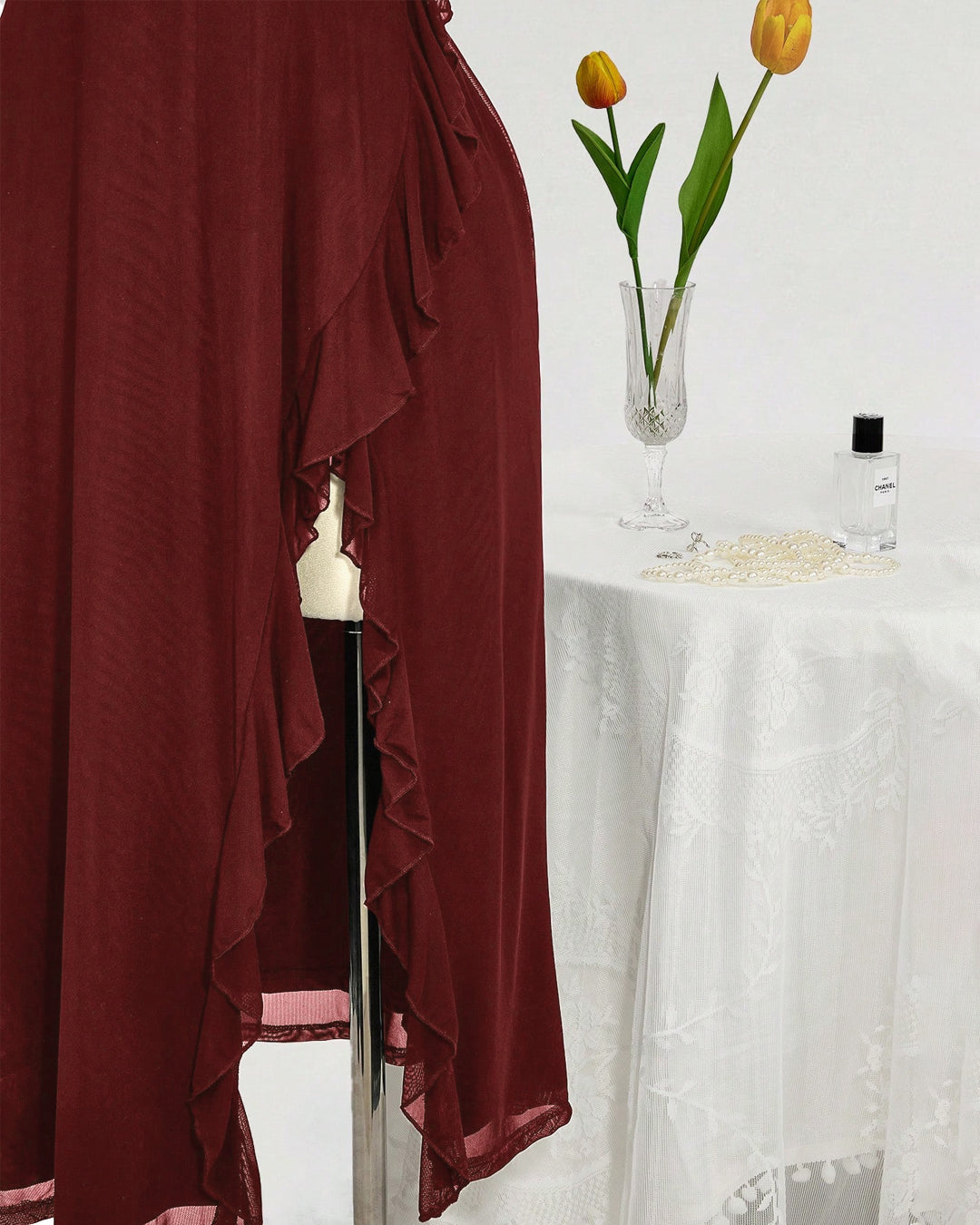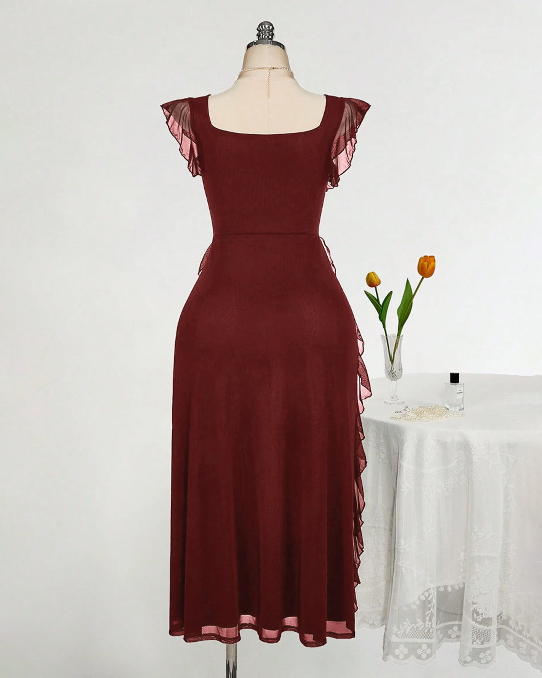 Square Neck Ruffle Trim Slit Fitted Dress Curve & Plus in Maroon