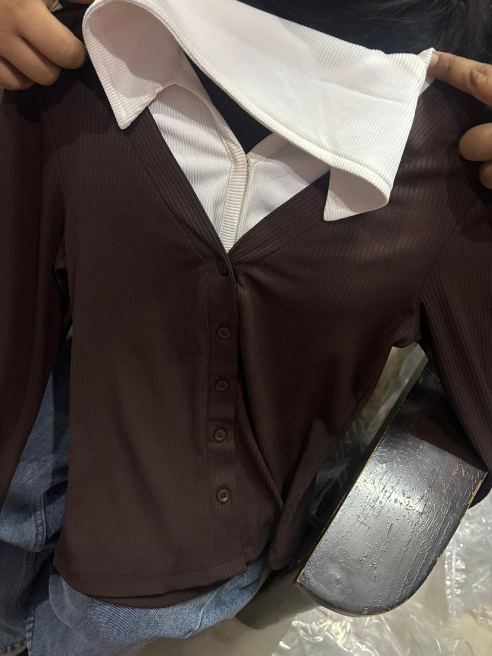 Introducing our Collar Patchy Embroidery Button Long Sleeve Chocolate Brown Top. This long sleeve chocolate brown top brings polished structure with a modern contrast. Designed with a crisp white collar, front button-down closure, and tailored silhouette, it’s your everyday upgrade to smart casual. The embroidered detailing adds subtle texture, while the chocolate tone keeps it grounded and versatile.