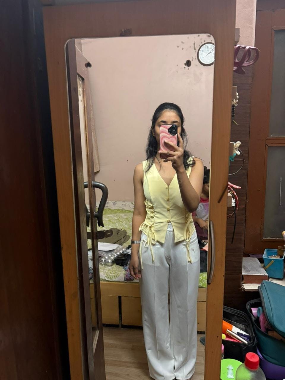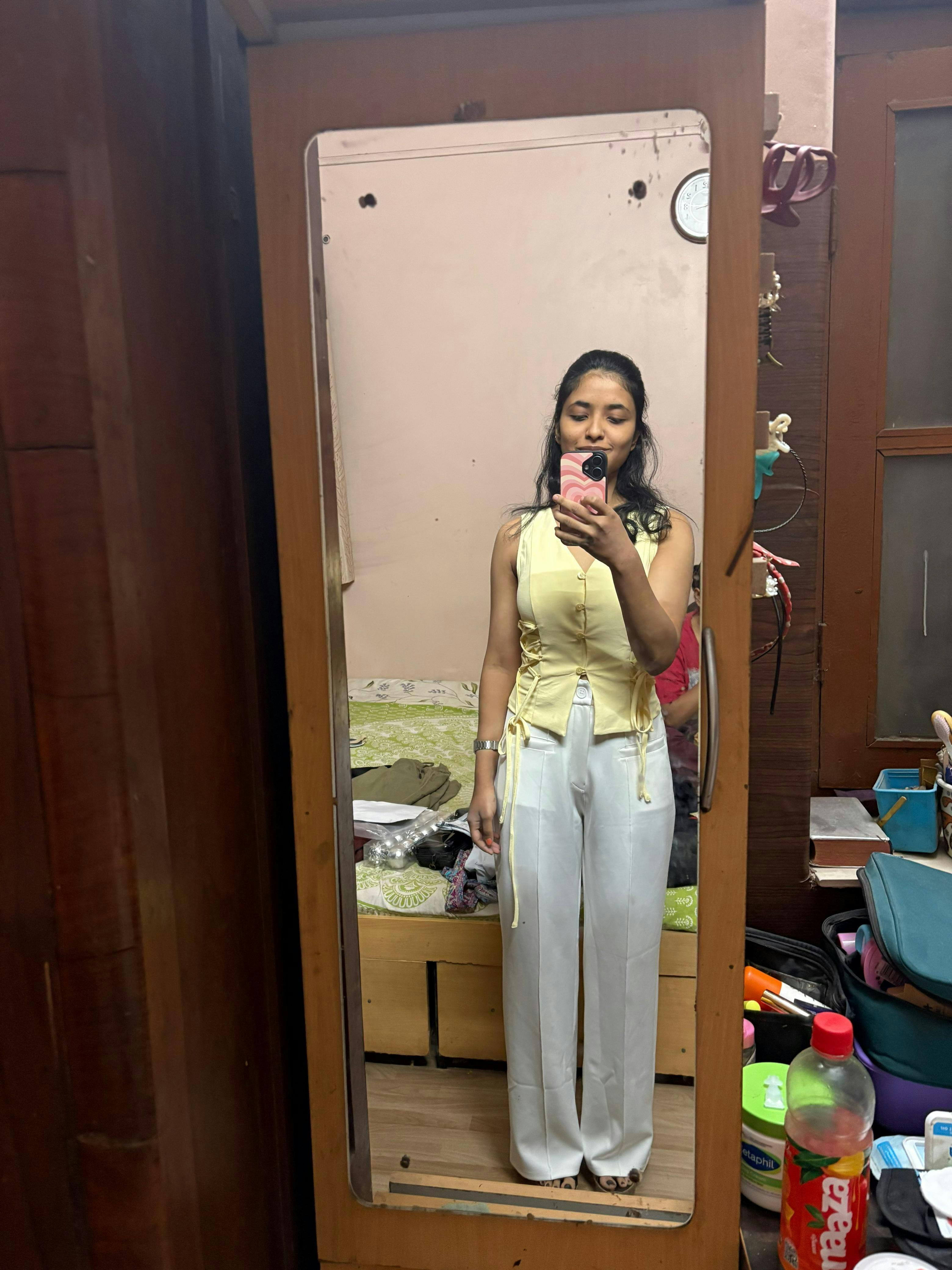 2-Piece Vanilla Corset Vest & White High-Rise Trousers Set blends structured elegance with a touch of contemporary flair. The fitted corset-style vest features lace-up sides and a flattering V-neckline, creating a sleek silhouette. The crisp white high rise trousers bring tailored polish, making this co-ord perfect for statement looks without sacrificing comfort.