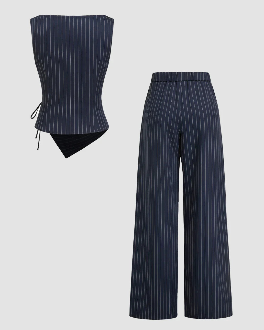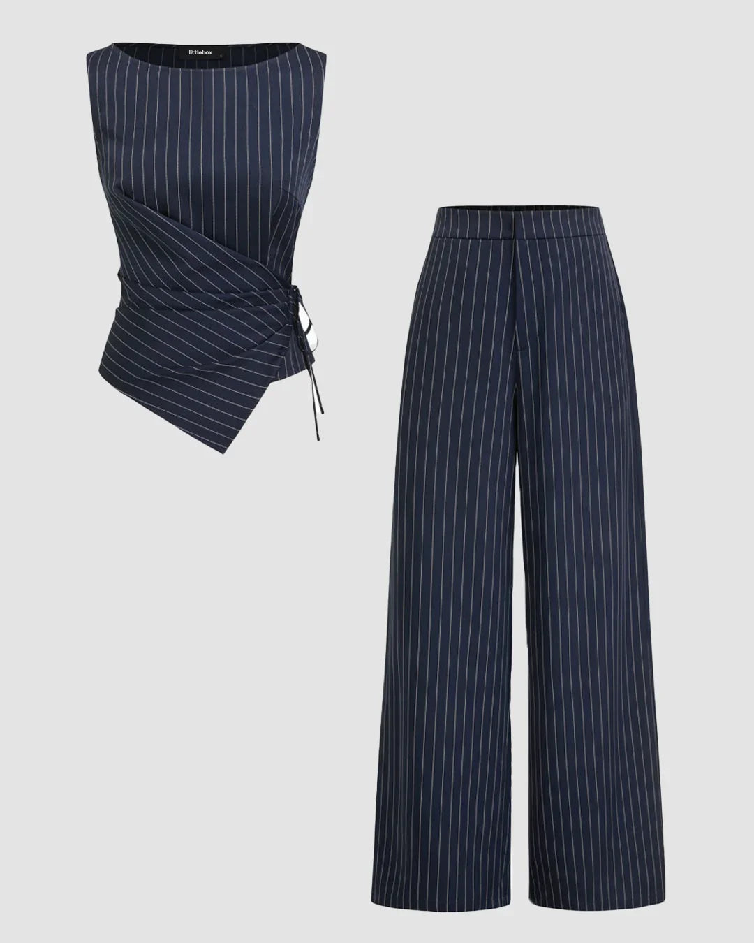 Boat Neck Striped Wrap Knotted Top & Mid Rise Straight Leg Trousers Set
