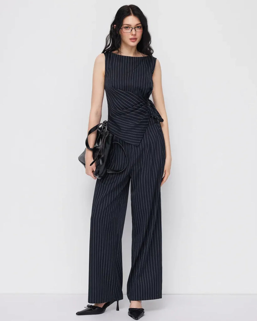 This Top & Mid Rise Straight Leg Trousers Set blends clean lines with a polished, modern shape. The boat neck keeps it minimal, while the wrap-knotted detail adds a sharp, structured vibe that feels fresh. The trousers balance it out with a straight leg fit that looks effortless and put together. The striped pattern keeps the whole look sleek without trying too hard. Fabric is soft, smooth, and easy on the skin, making the set wearable for long hours.