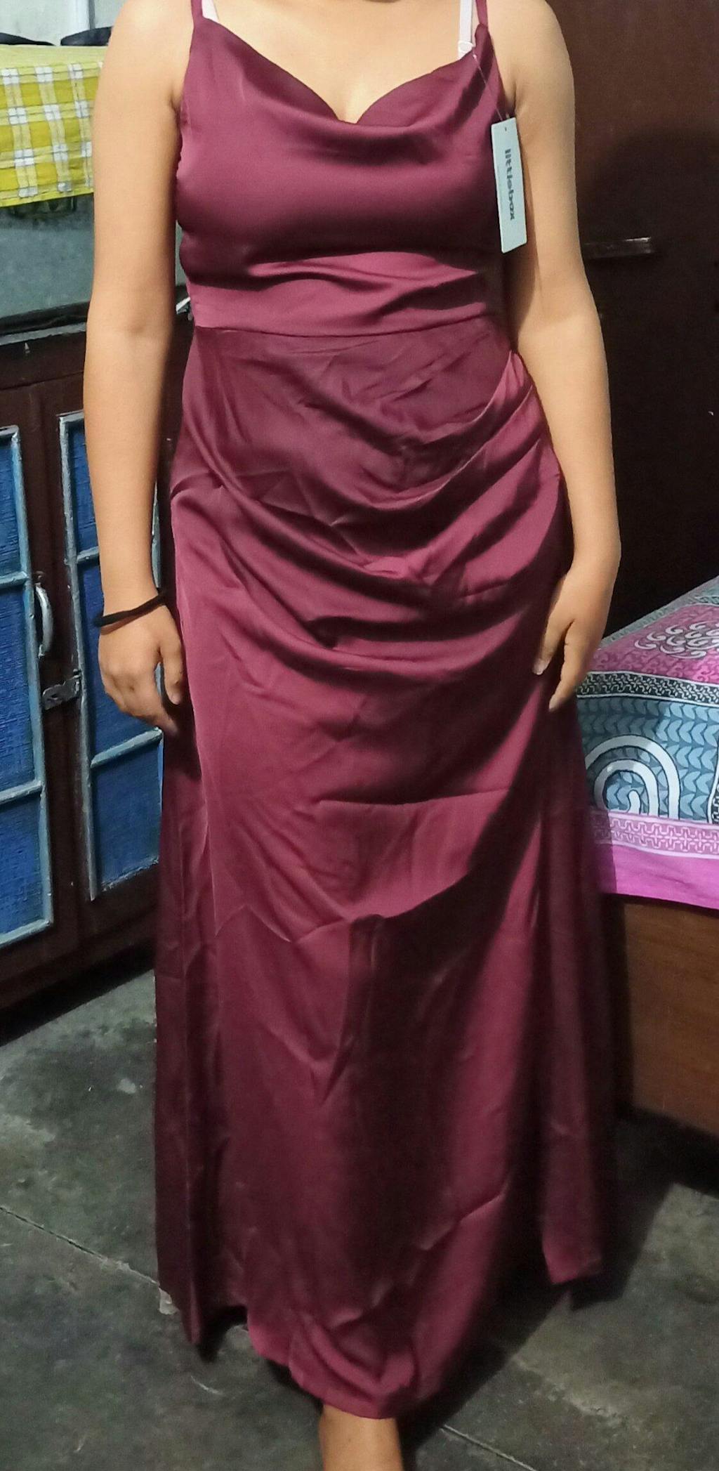 This cowl neck maxi dress brings a smooth, elegant look with a soft draped finish. Designed with delicate shoulder straps and a flattering cowl neckline, it creates a relaxed yet polished silhouette. The fitted waist flows into a sleek maxi length, giving the dress a clean and graceful shape. The maroon colour adds richness and depth, making it feel dressy without being overdone. Crafted in satin-finish fabric, it has a subtle sheen that elevates the overall look.