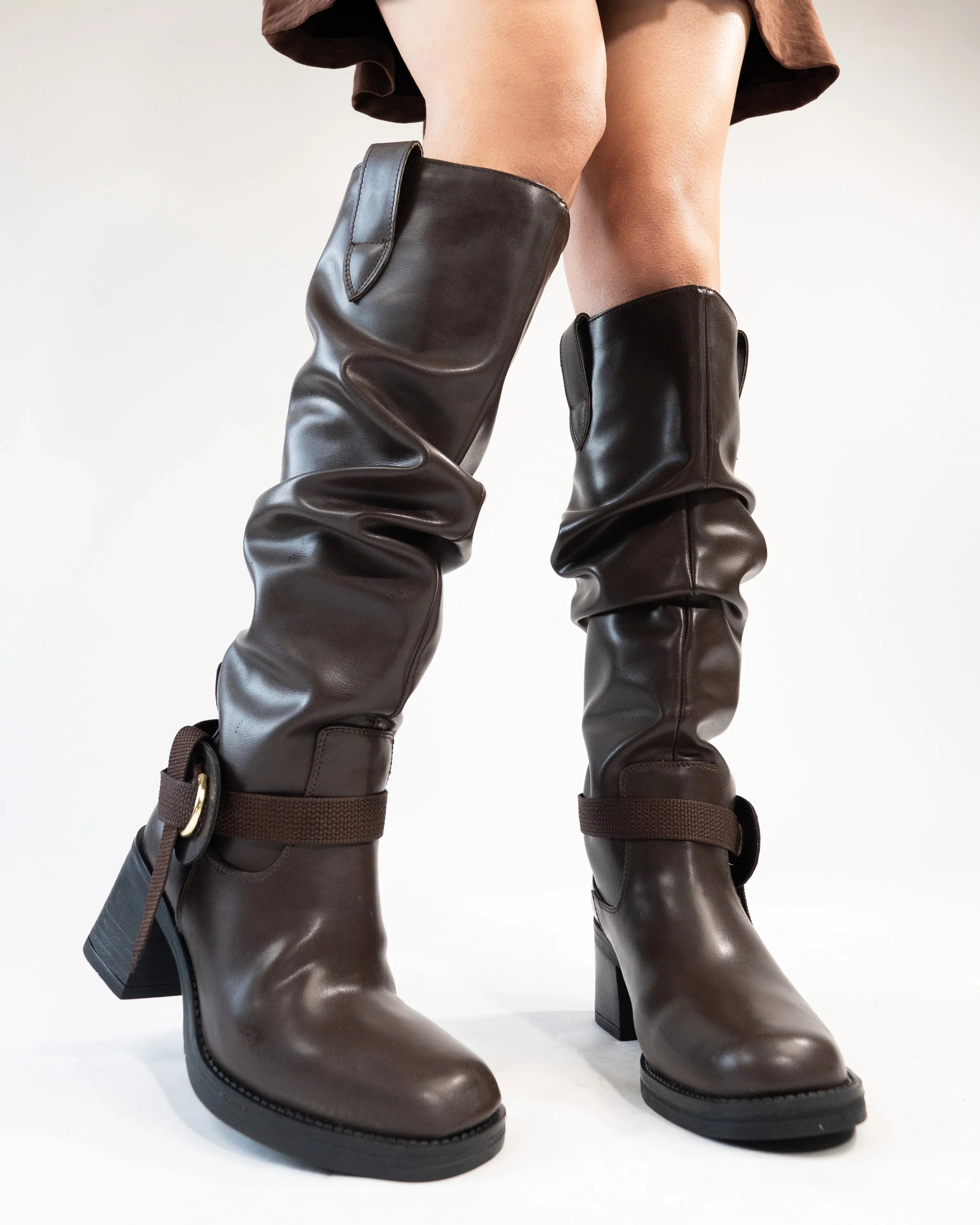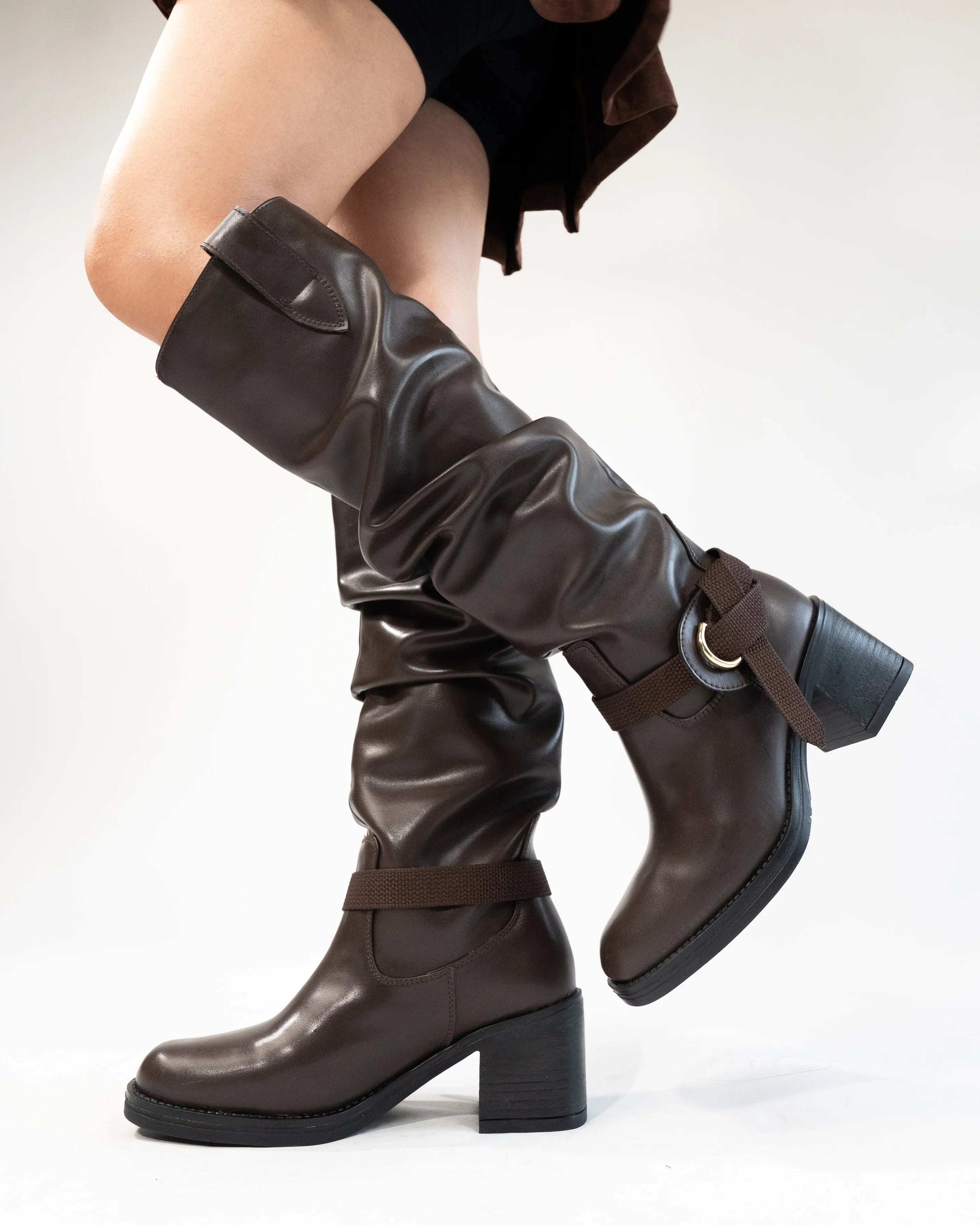 Brown Knee-High Boots With Buckle And Heel