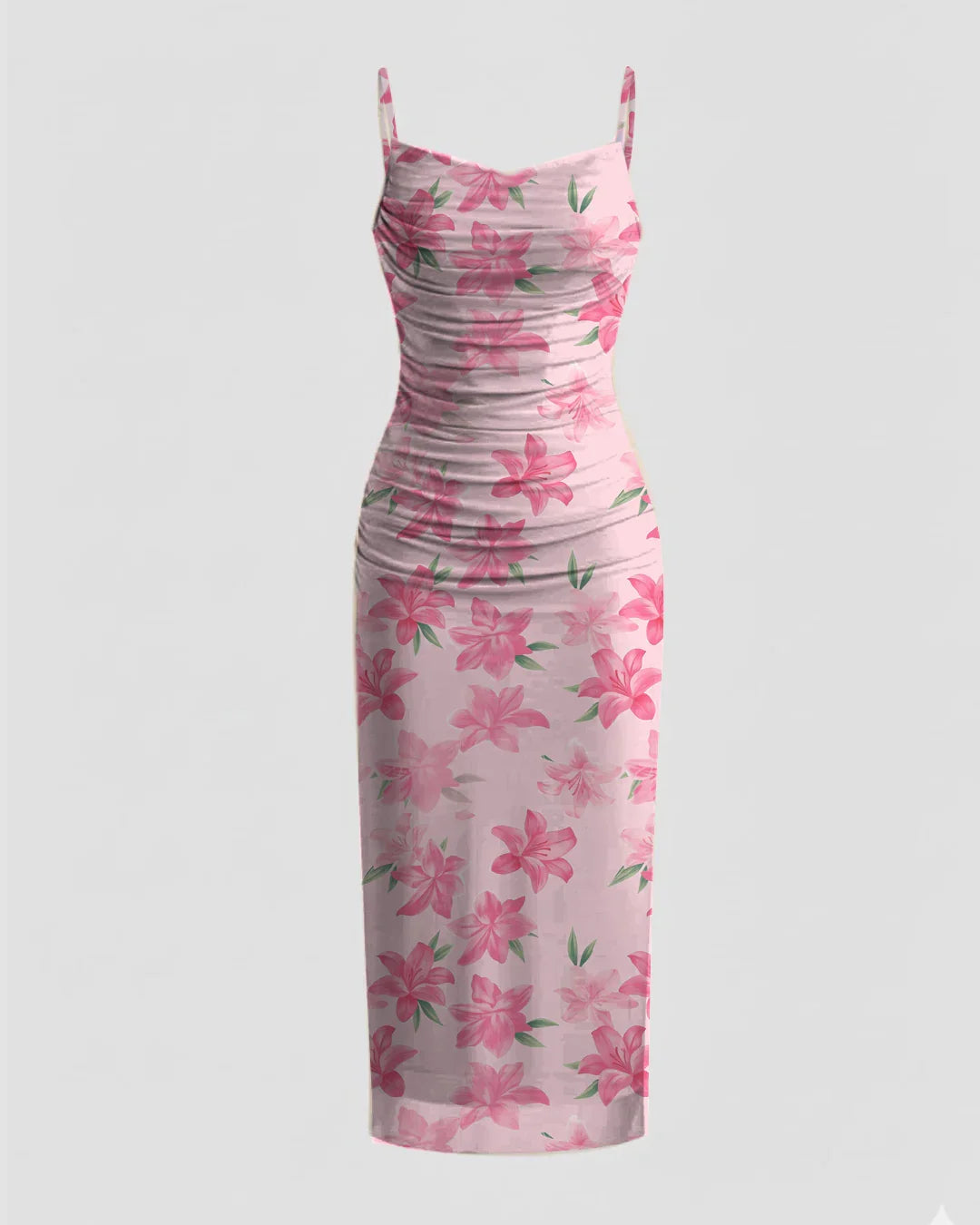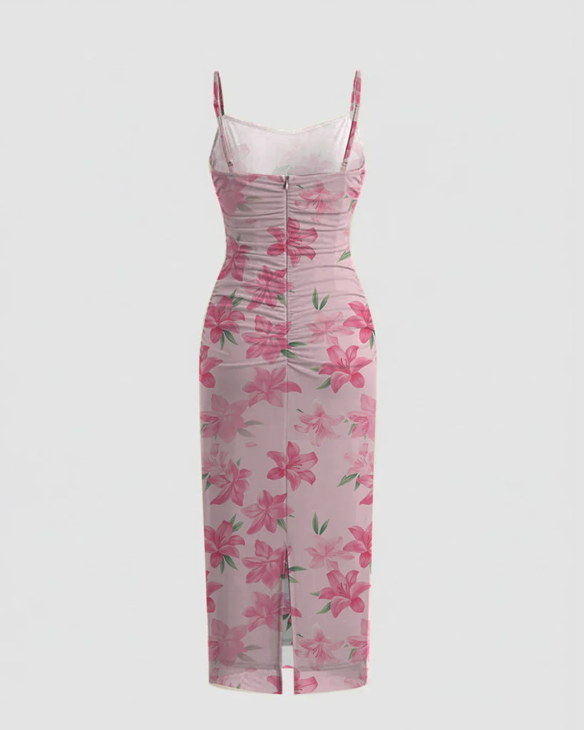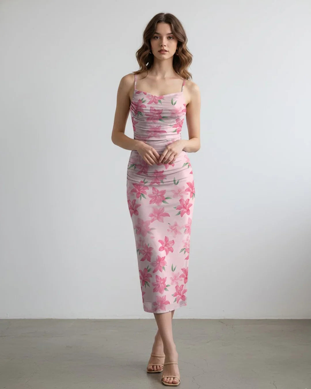 Pink Floral Spaghetti Strap Ruched Bodycon Midi Dress