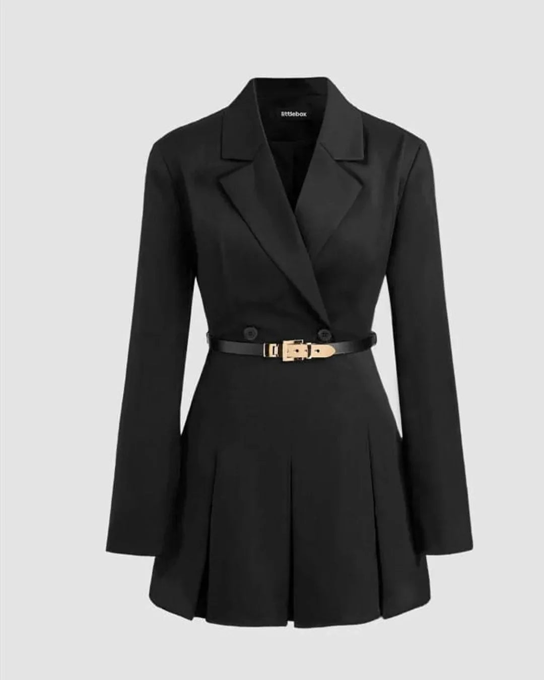 Solid Color Split Button Blazer Mini Dress Without Belt In Black