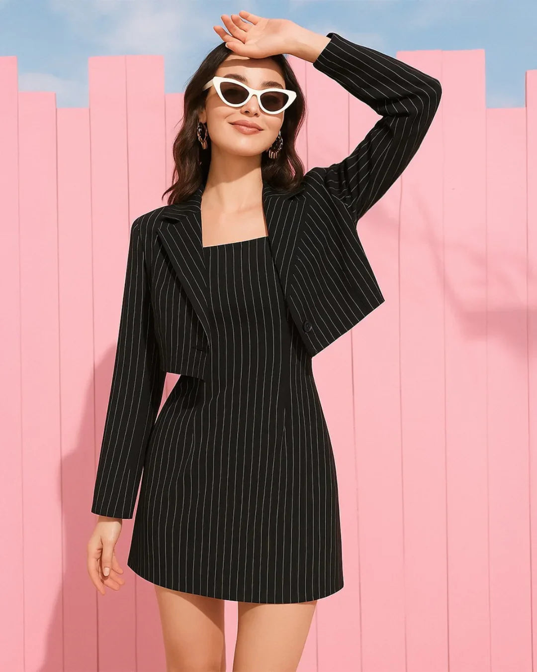 We are introducing our Striped Shirt with Lapel Collar & Spaghetti Strap Dress Set a stylish two-piece combo featuring a striped collared shirt with long sleeves and buttoned cuffs that brings a structured, polished look. The spaghetti strap dress adds a sleek, modern finish with its clean lines and minimal detailing.