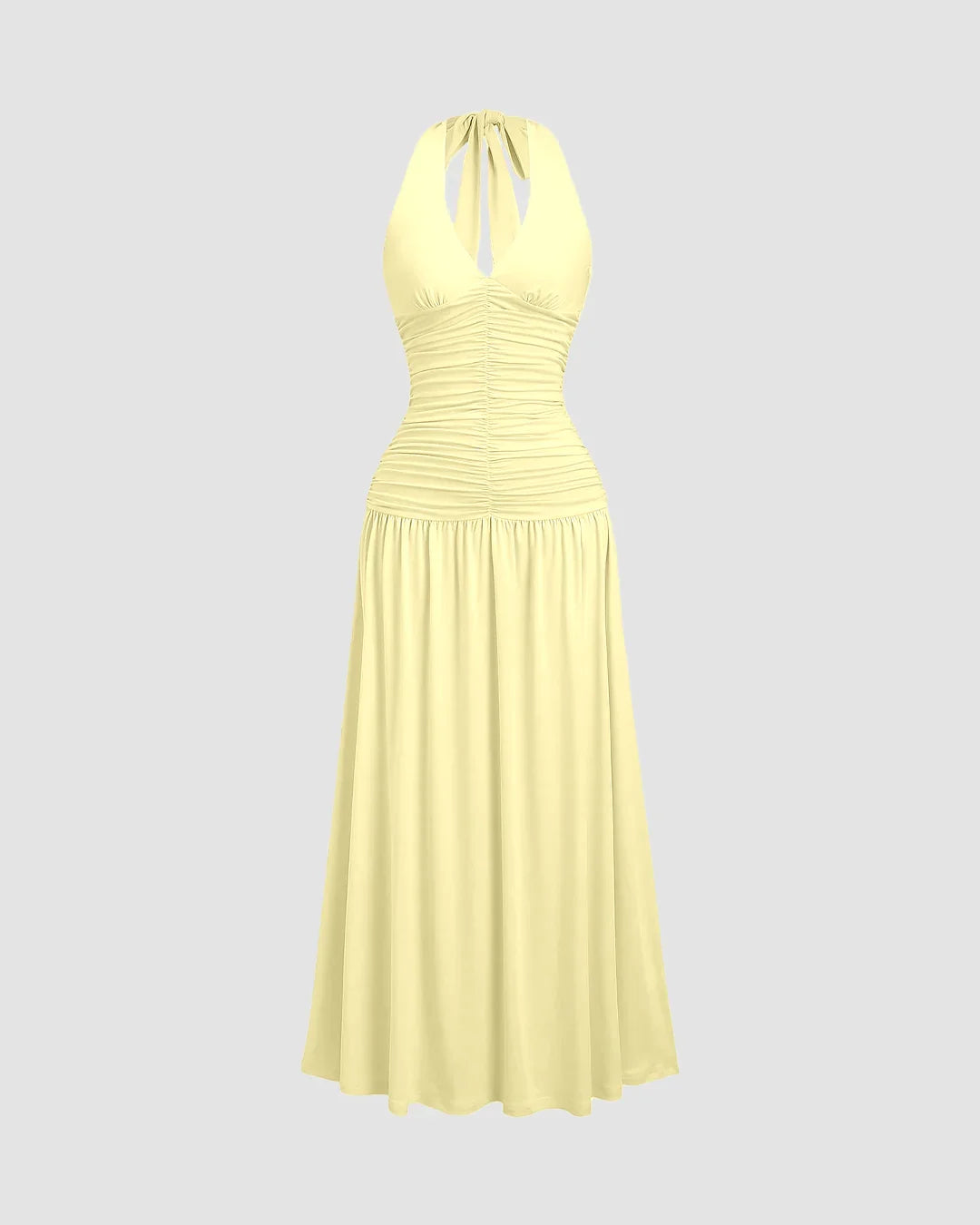This backless midi dress is your perfect companion for sunshine-filled days and slow, dreamy sunsets. Featuring a halter neck tie, a ruched bodice, and a flowing skirt, it’s designed to highlight every curve while staying effortlessly light and breezy. The open back adds a bold, airy touch you’ll want to wear again and again.