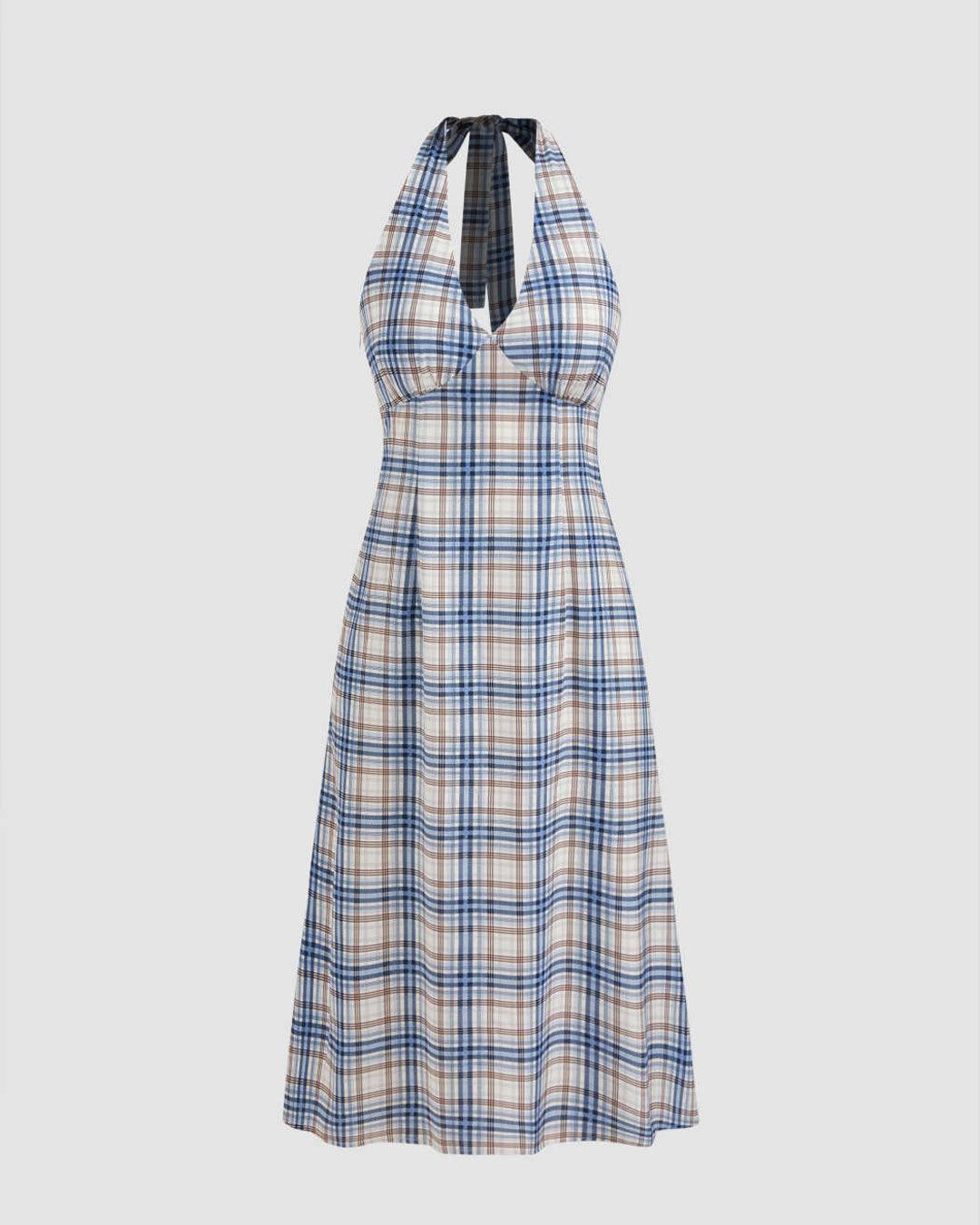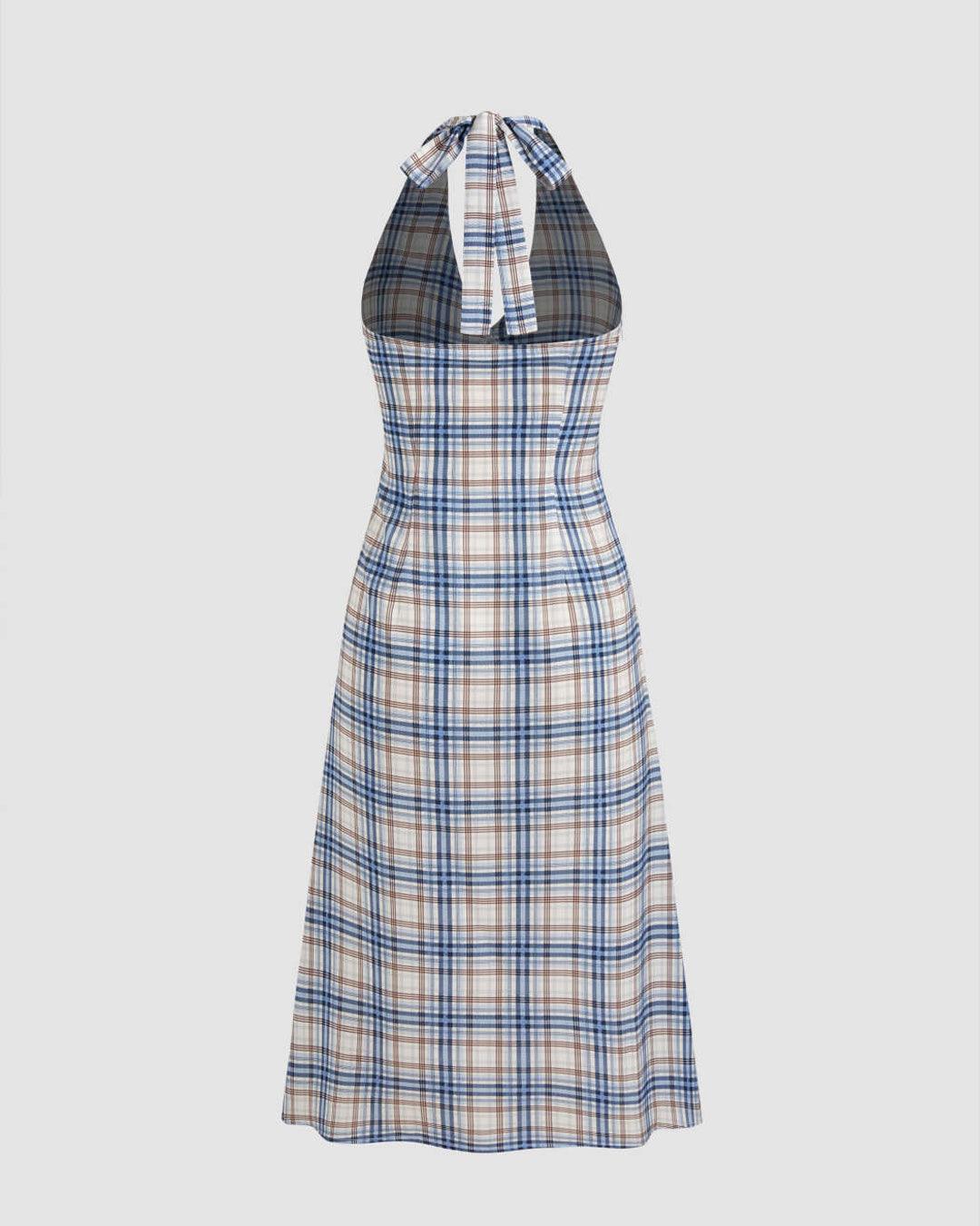 The check midi dress that brings retro charm with a modern mood. Designed with a halter neckline and subtle bust gathering, it softly follows your frame before flaring into a relaxed A-line hem. The woven texture and tan-blue plaid combo give it a low-key vintage vibe you’ll wear on repeat.