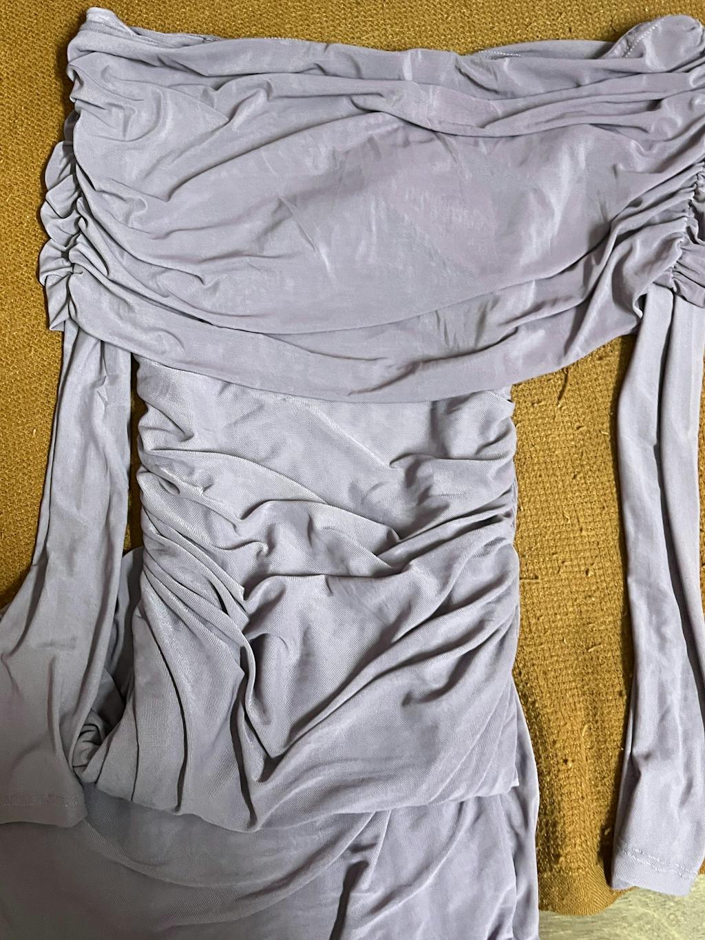 Off Shoulder Mesh Ruched Fitted Dress With Long Sleeve in Lilac