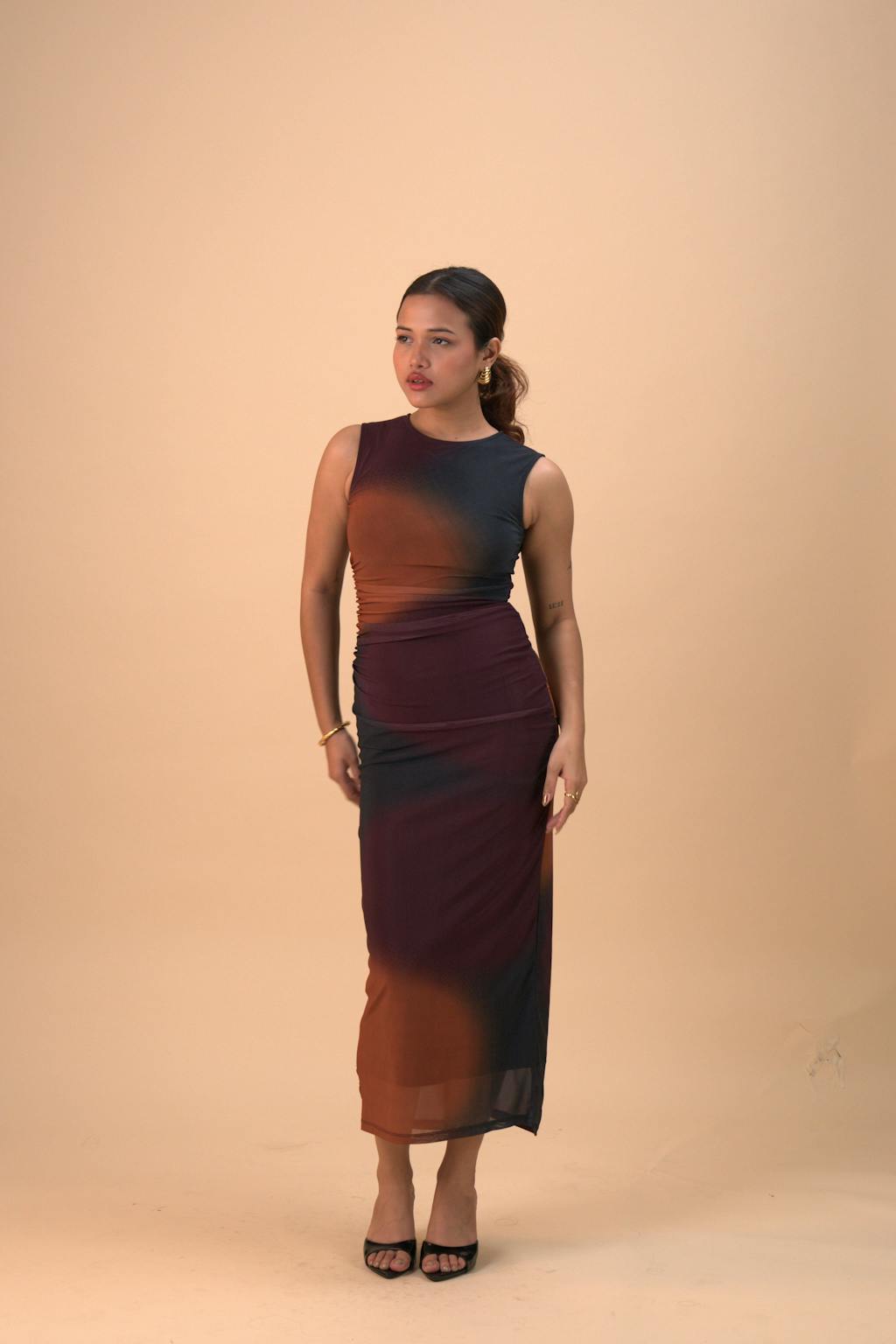 Bold and modern, this sleeveless maxi dress features a tie-dye effect with a sheer mesh finish for a statement look. The body-hugging fit with a side slit adds just the right amount of edge, while the lightweight stretch fabric ensures comfort and movement. Perfect for night outs or special occasions, this sleeveless maxi dress is designed to stand out effortlessly.