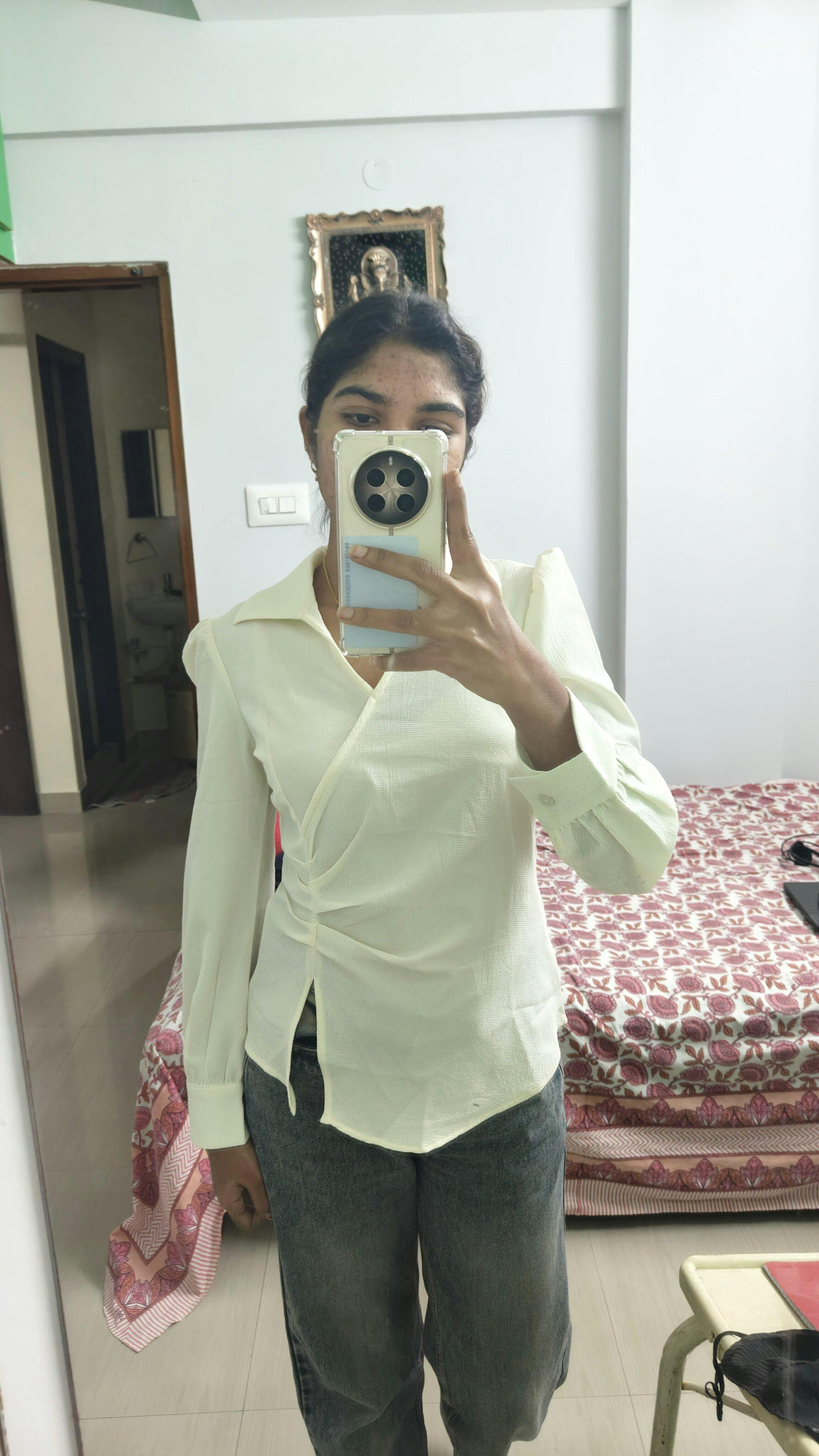 Introducing our V Neck Wrap Front With Lantern Sleeve Top in Off-White. This lantern sleeve top gives your everyday looks a crisp, tailored twist with a wrap silhouette that highlights your waist just right. The V neckline and dramatic sleeves bring soft structure and vintage energy to your fit, effortlessly chic from desk to dinner.
