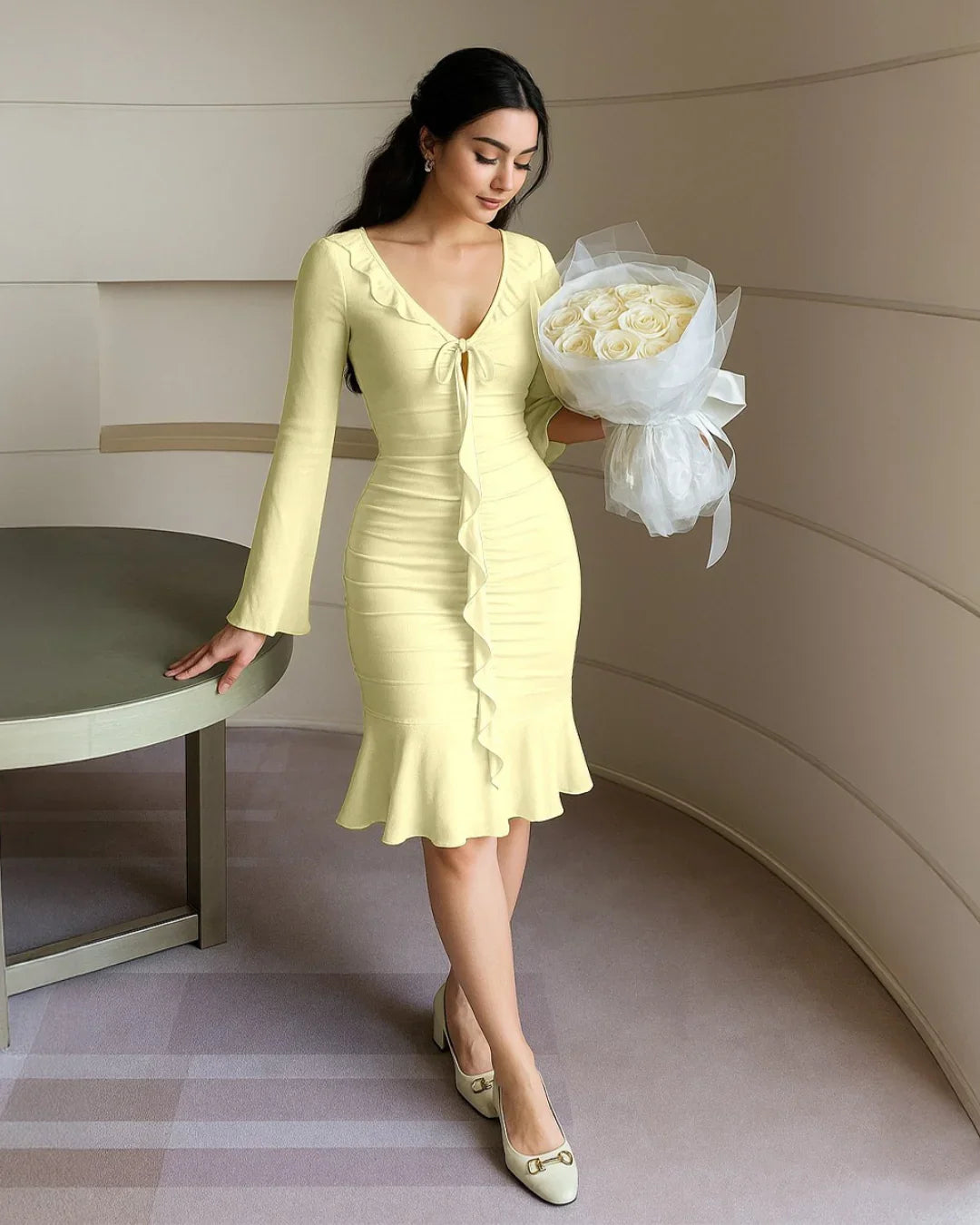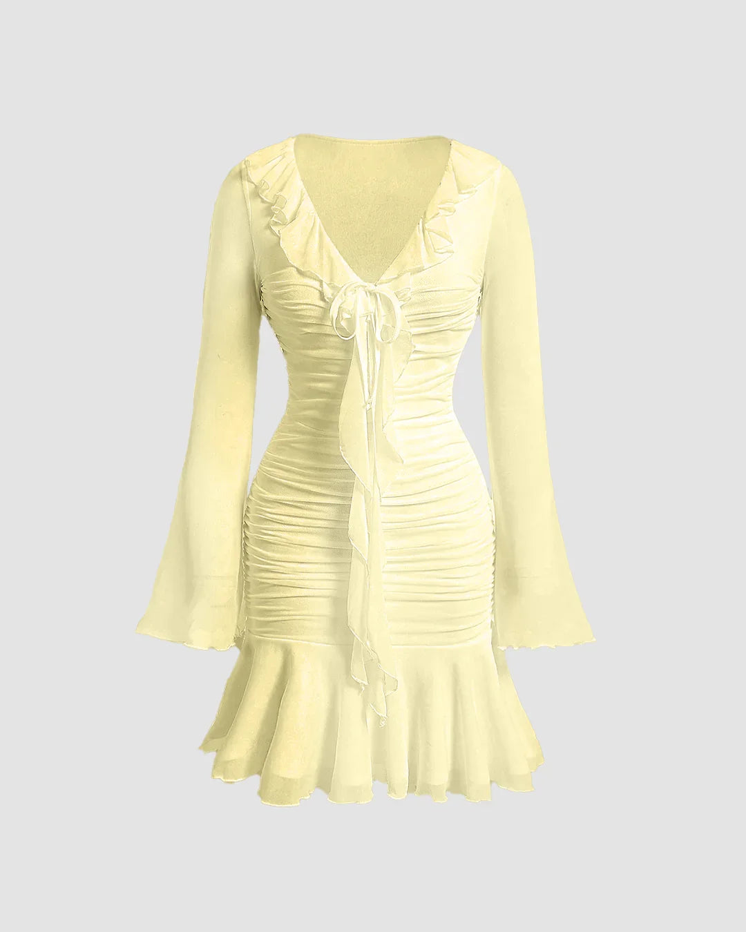 Soft, sculpted, and a little bit vintage this long sleeves midi dress is your ticket to looking cute and confident. Designed with a ruched body, flared cuffs, and a tie-front ruffle neckline, it flatters every curve while keeping things sweet. The dreamy French vanilla hue adds softness to the silhouette.