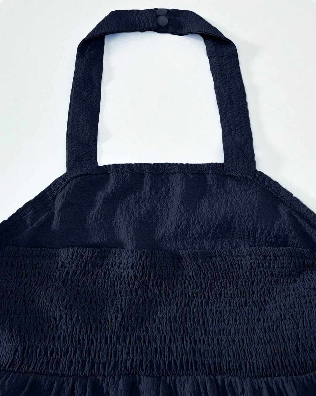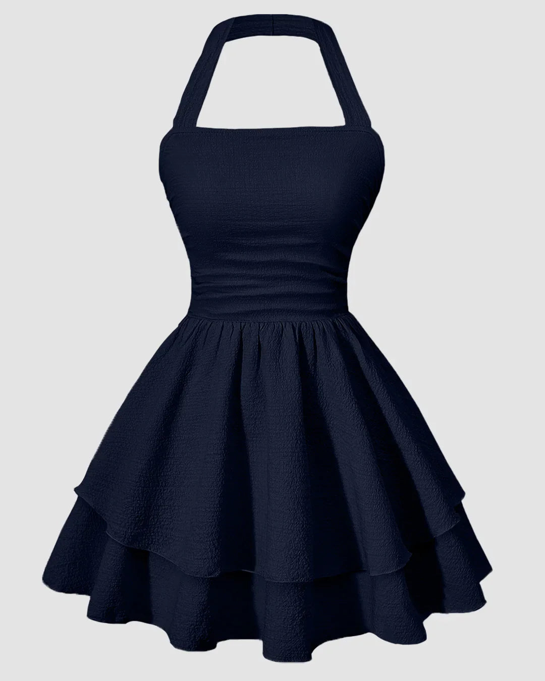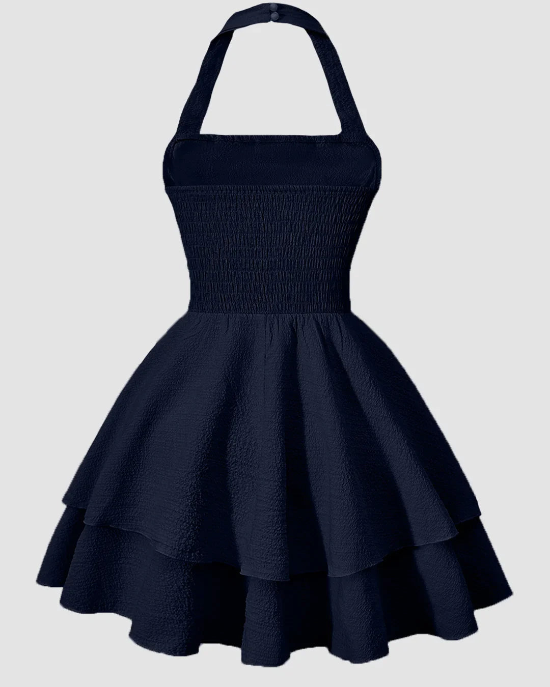 Halter Neck Ruched Waist Tiered Mini Dress in Navy Blue