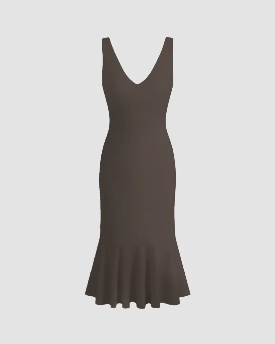 Coca Sleeveless Fishtail Hem Bodycon Dress is all about sleek lines and flattering curves. This fishtail dress hugs your figure beautifully before flaring out at the hem for a touch of drama. The sleeveless cut and deep V-neckline add a feminine edge, making it a perfect choice for evenings, parties, or special events.