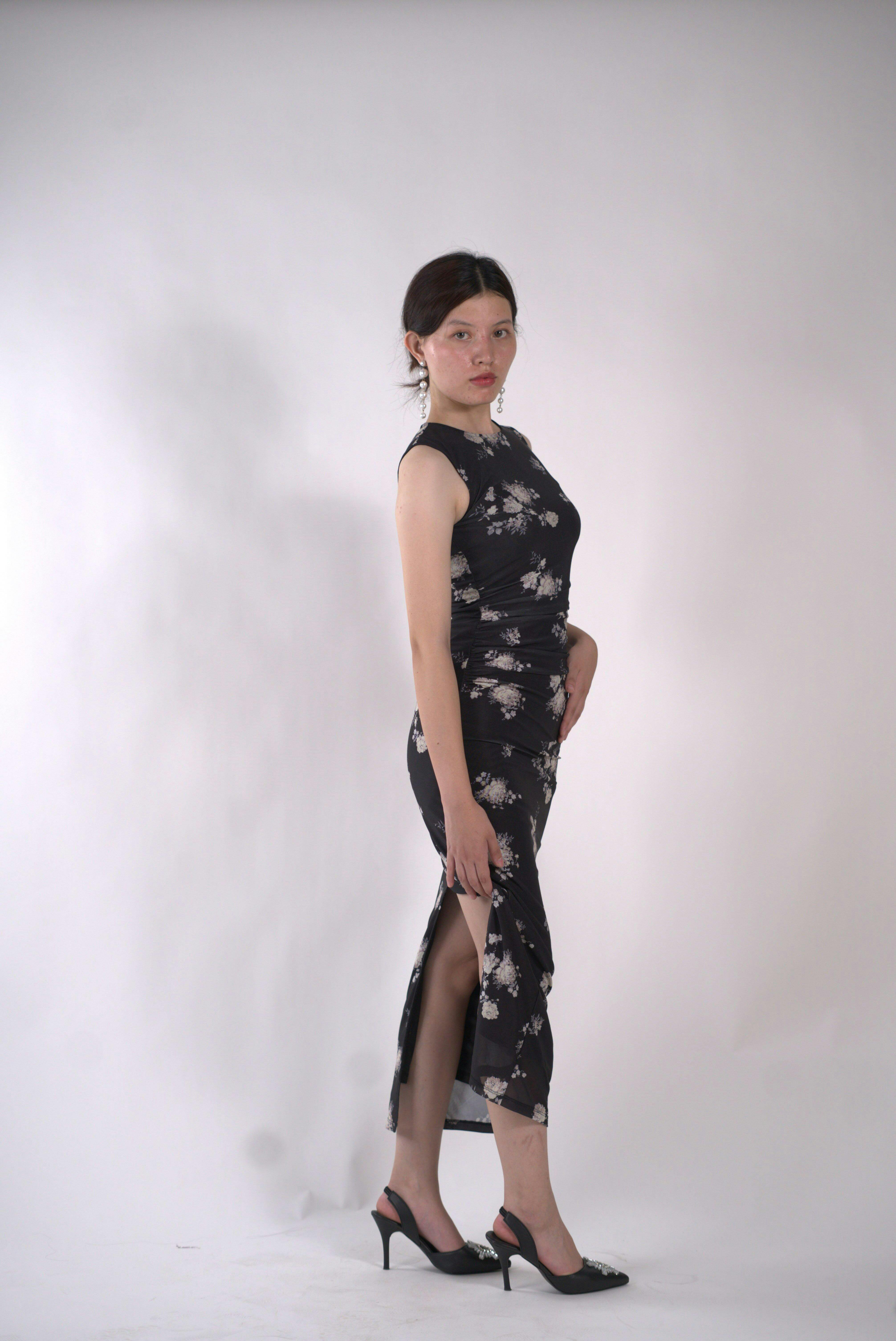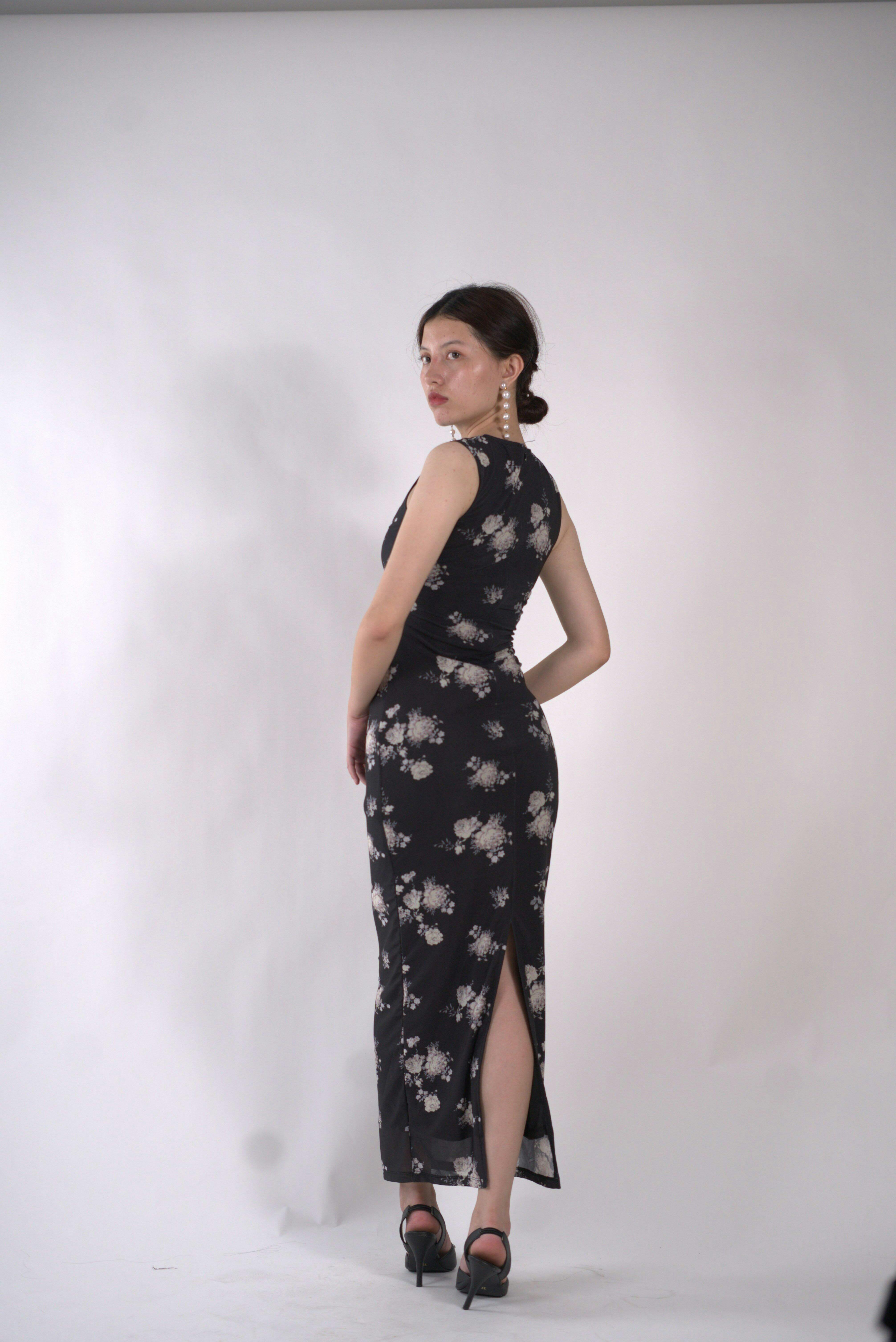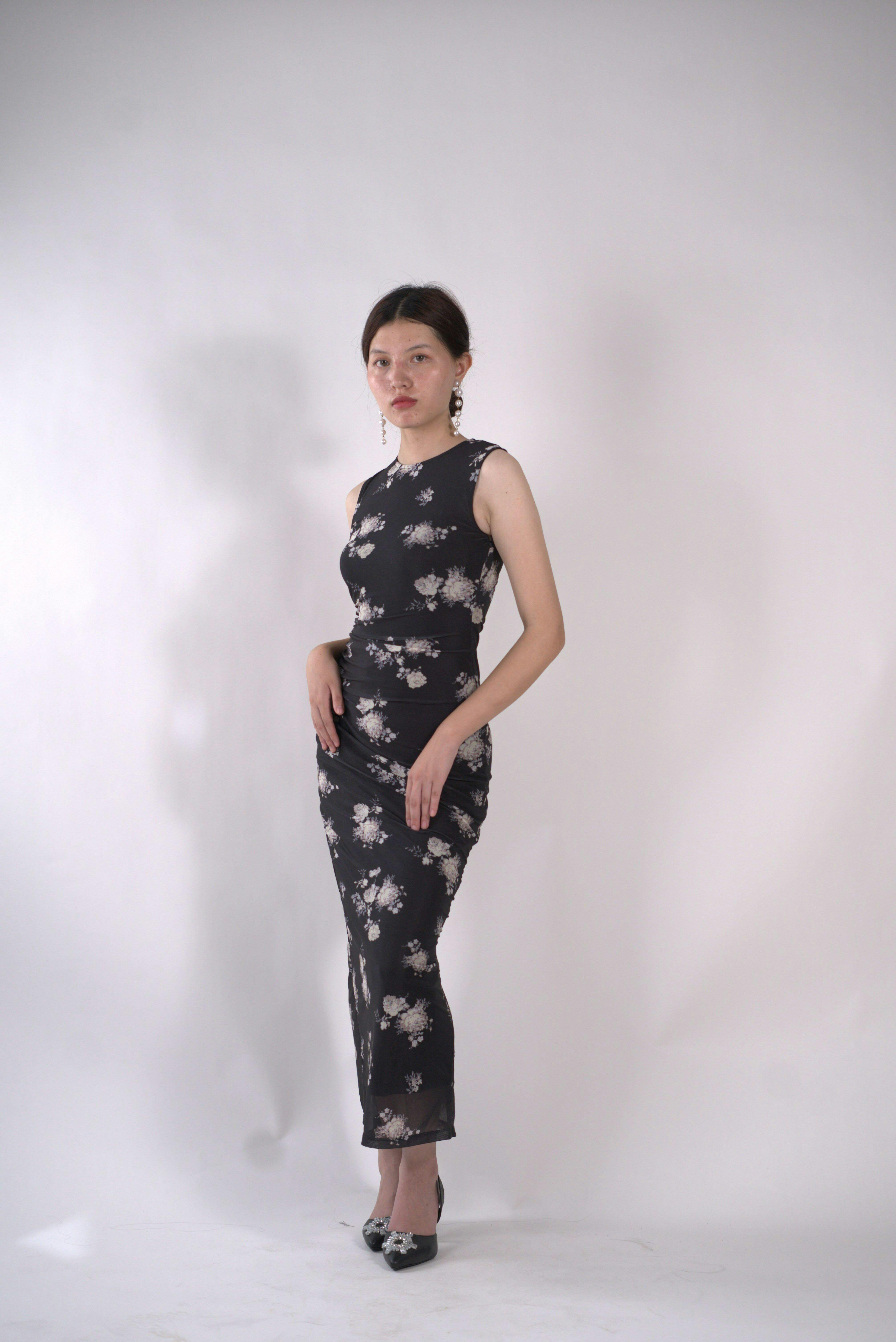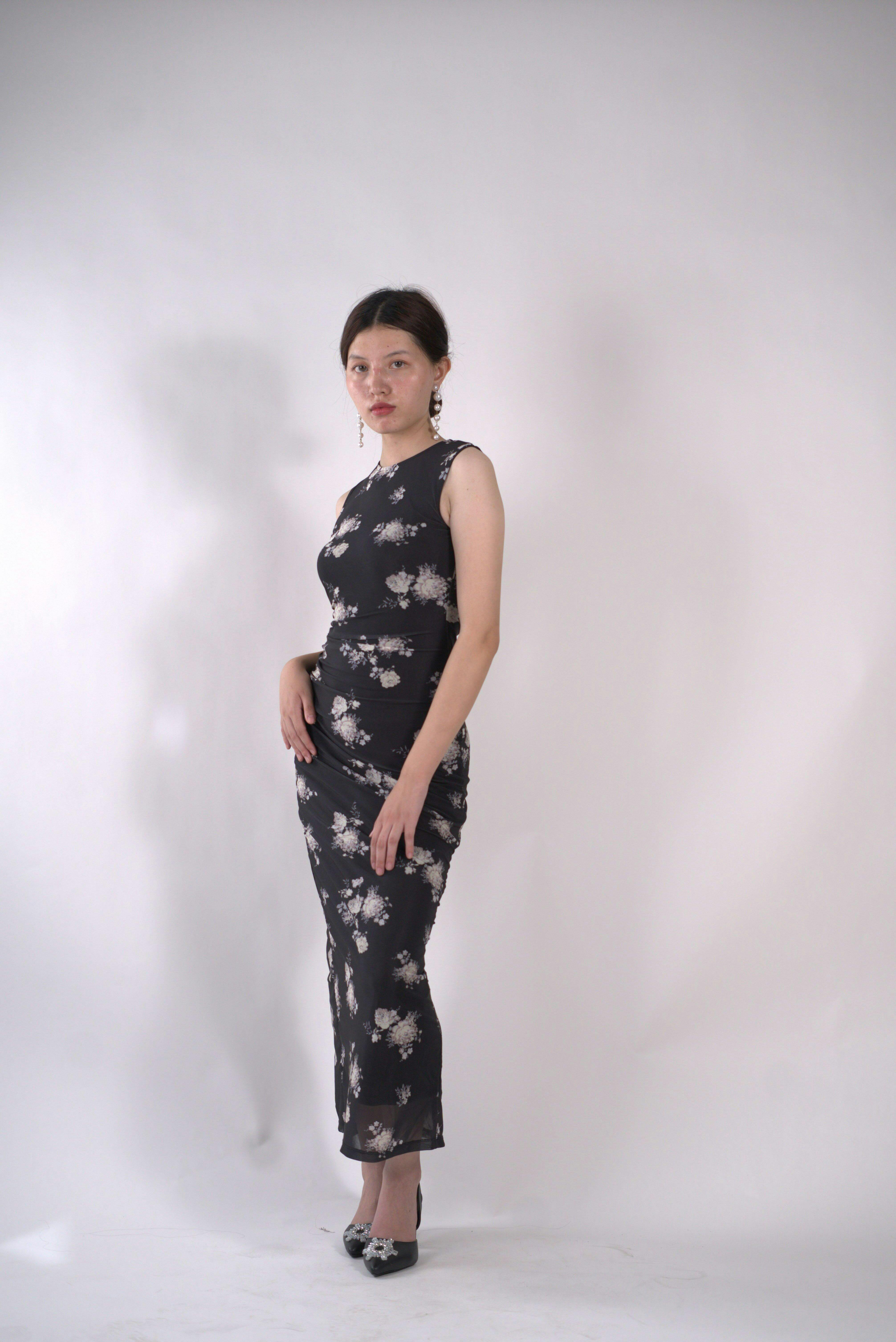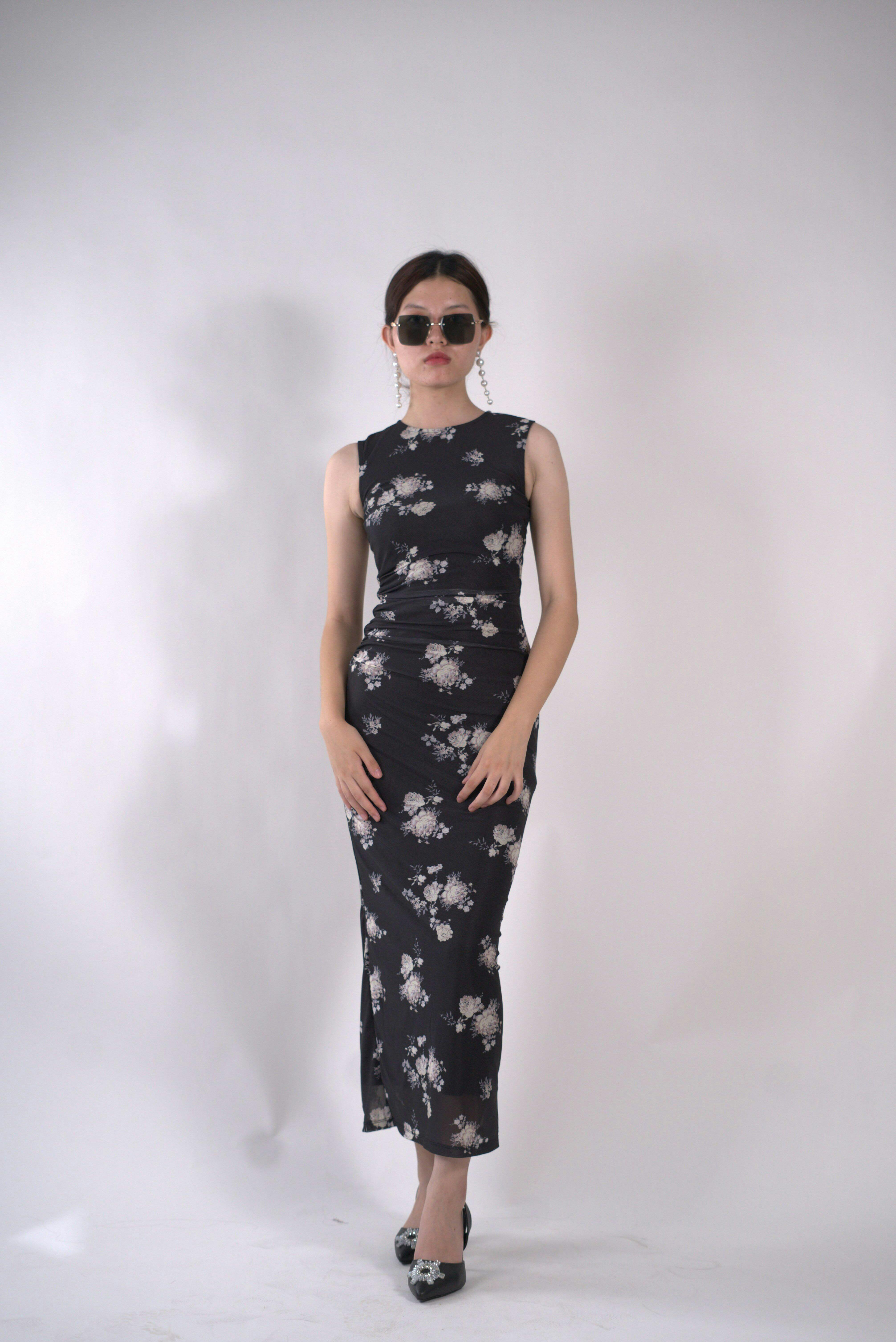 The Floral Print Mesh Ruched Black Bodycon Dress is your perfect mix of chic and sultry. Designed in sheer mesh with delicate floral prints, this black bodycon dress hugs your curves with ruched detailing that flatters every angle. Its sleeveless cut and midi length give it a polished yet playful vibe, making it a must-have for nights when you want to stand out.