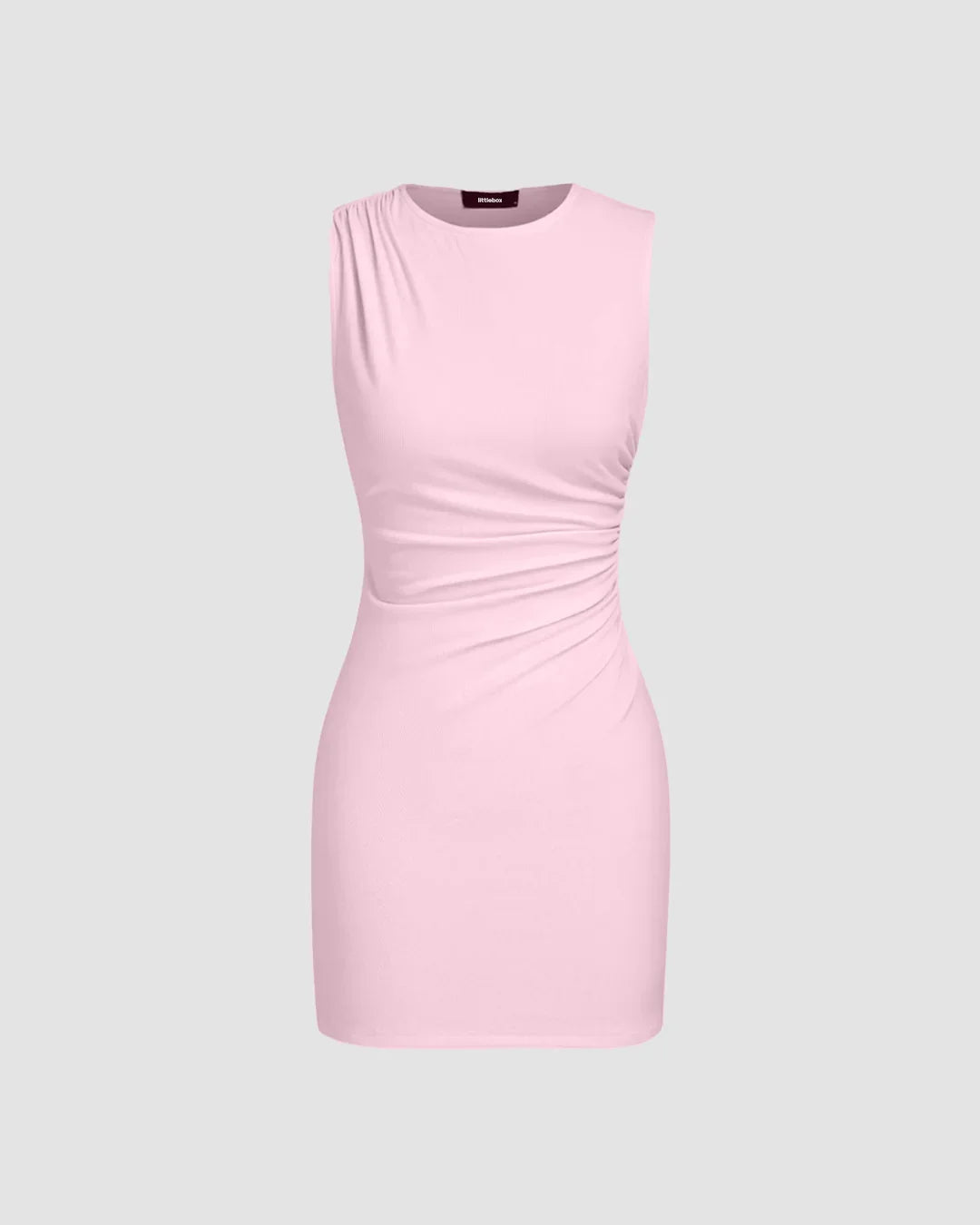 This ruched mini dress brings a soft sculpted silhouette in a dreamy pastel hue. Designed with a sleeveless cut and side gathers, it hugs your curves without feeling clingy. The baby pink color adds a romantic touch that works for both off-duty days and easy night plans.