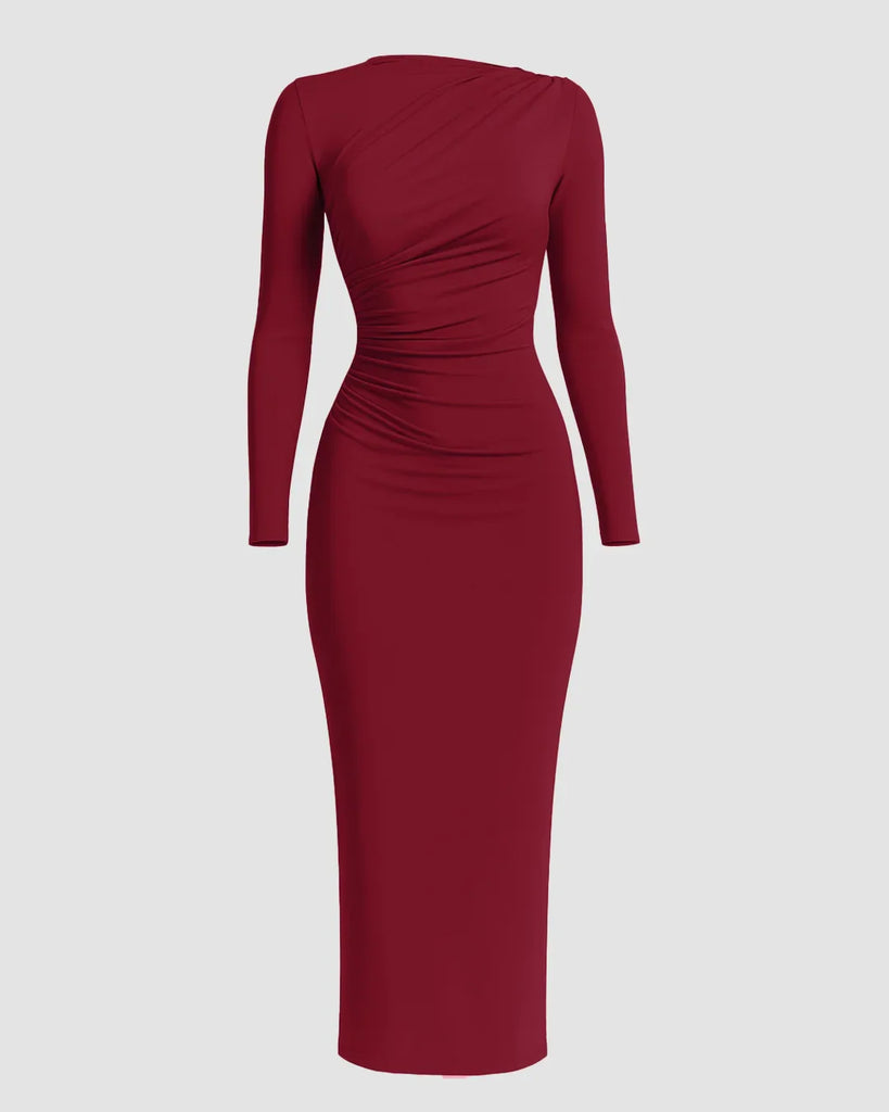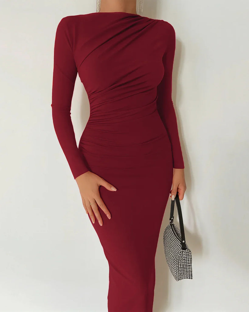 Meet the Solid Color Stand Collar Long Sleeve Pleated Bodycon Dress In Redberry, your go-to for a sleek, snatched look. This long sleeve bodycon dress is made to hug your curves with a flattering pleated design and a classy high neckline. It’s bold, minimal, and made for standing out without trying too hard.