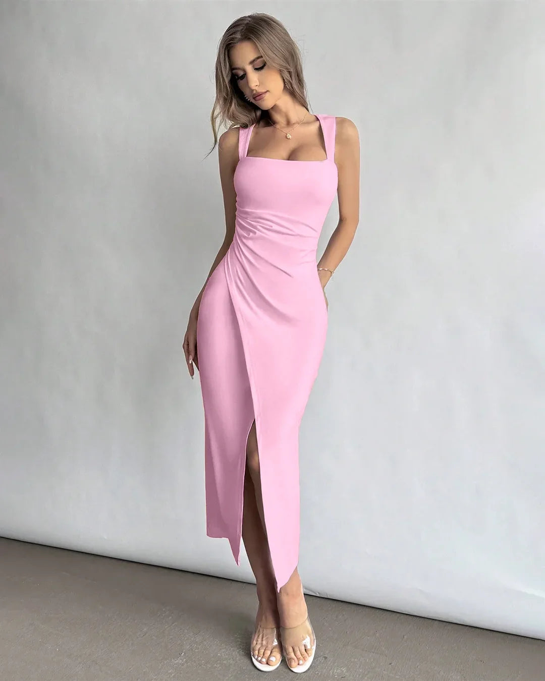 Square Neck Ruched Slit Midi Dress in Prism Pink is made for those standout moments. This pink midi dress features a sleek square neckline, flattering side ruching, and a thigh-high slit for that perfect balance of elegance and allure. Designed with a body-skimming fit, it creates a confident, feminine silhouette for evenings out or special occasions.