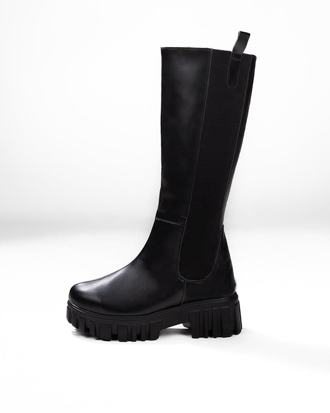 Chunky Sole Boots Round Toe Zipper Casual Boots in Black bring a bold edge to everyday footwear. Designed with a clean black finish and a strong knee-length silhouette, these boots stand out with their chunky sole that adds height without feeling heavy. The smooth upper keeps the look sharp, while the side zipper makes them easy to slip on and off. With a sturdy build and cushioned feel, these Chunky Sole Boots balance street style with comfort, making them a solid pick for confident, everyday looks.