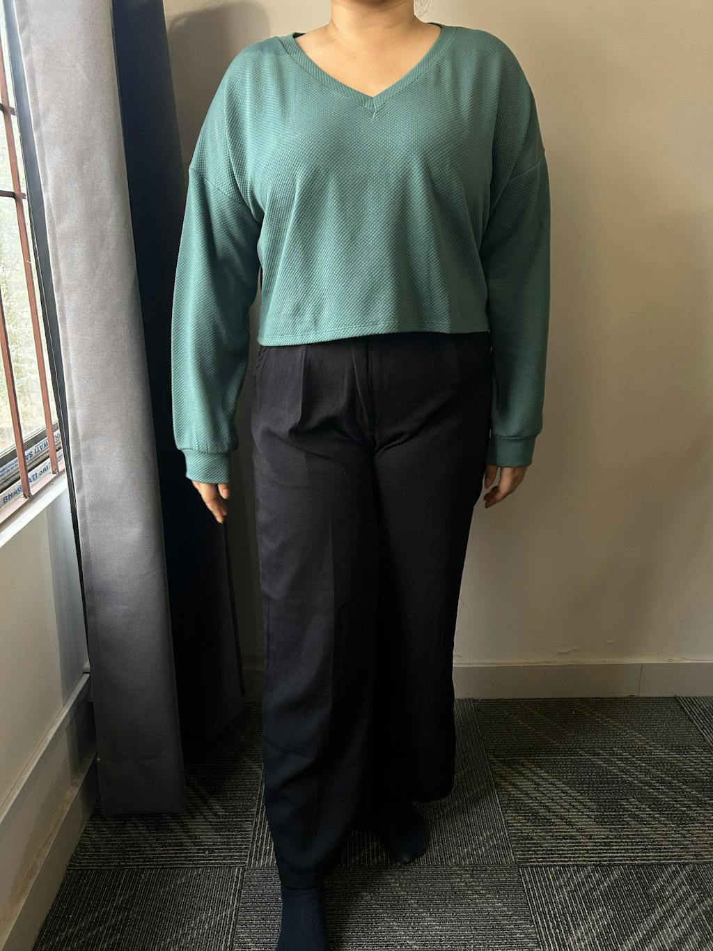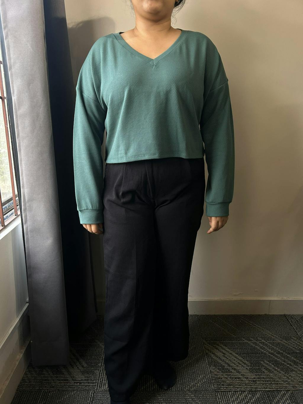 This crop top sweater brings a cozy, laid-back vibe with a clean, modern finish. Designed with a relaxed fit and a flattering V-neckline, it sits comfortably on the body without feeling bulky. The ribbed texture adds subtle detail while keeping the look simple and wearable. Dropped shoulders and full sleeves give it an easy, slouchy feel that works well for everyday styling. Made from a soft polyester and cotton blend, this crop top sweater feels warm yet breathable, making it perfect for mild weather and layering days.