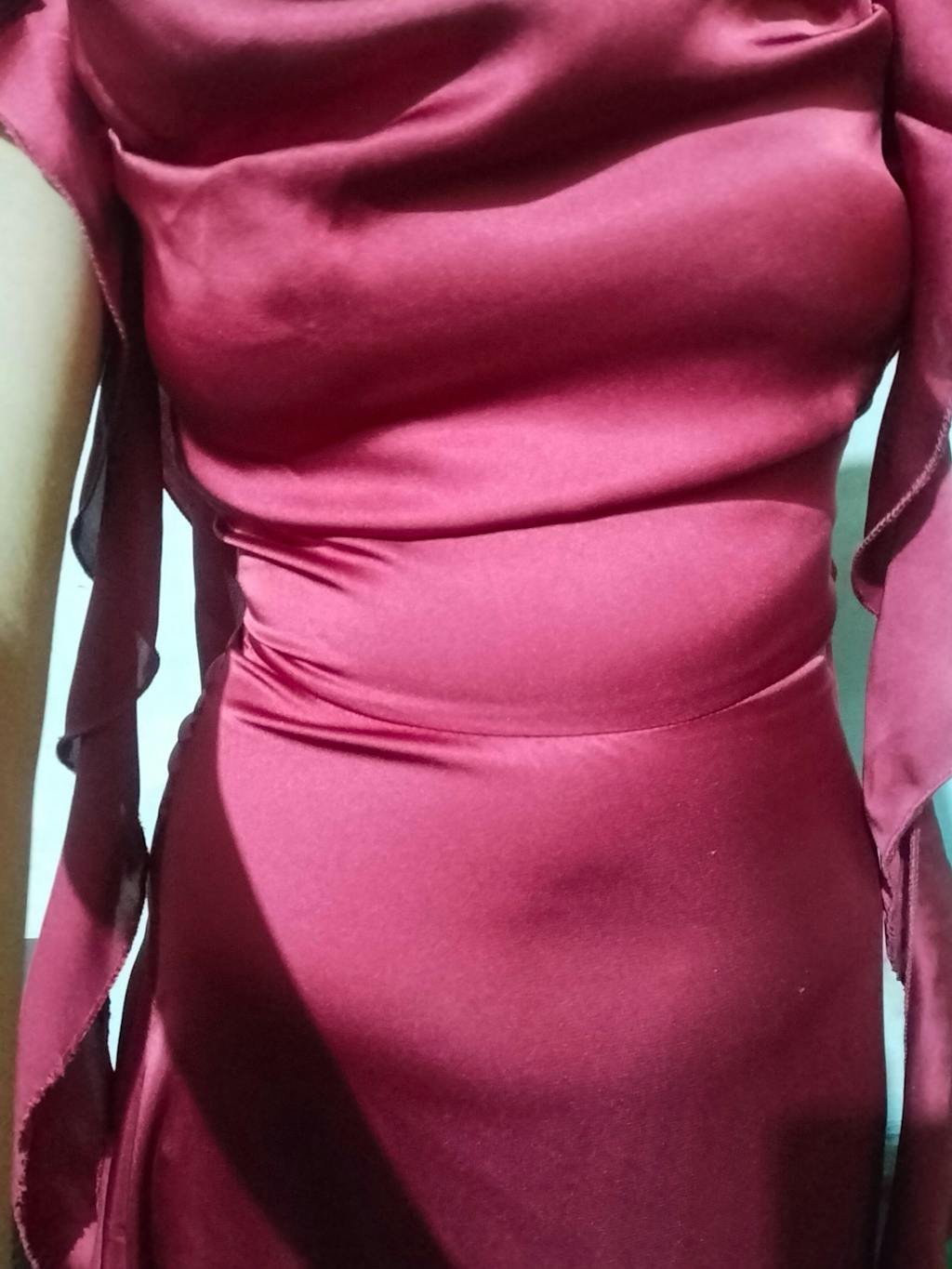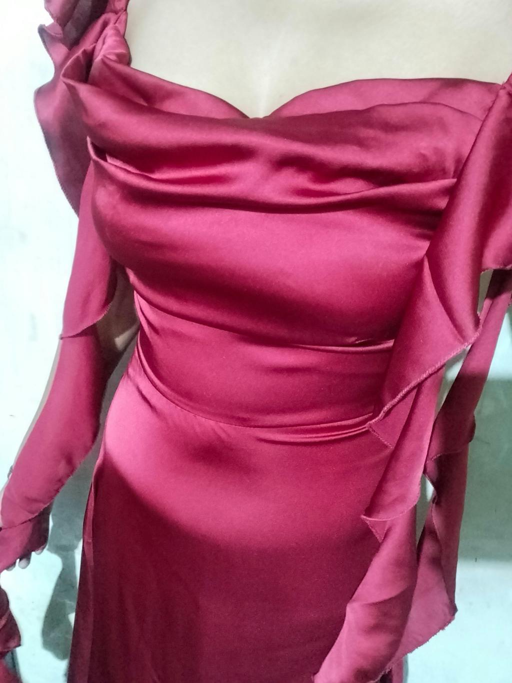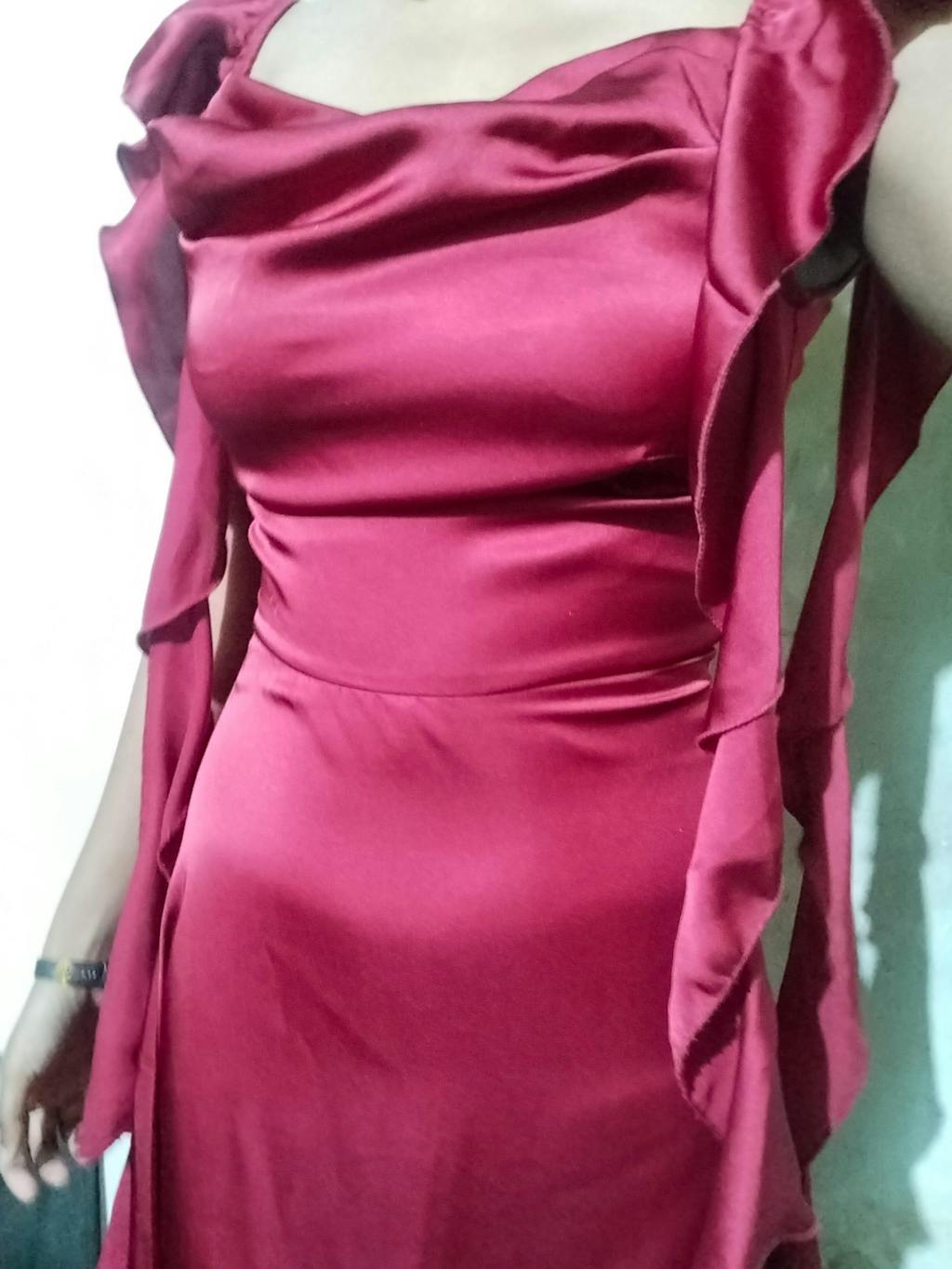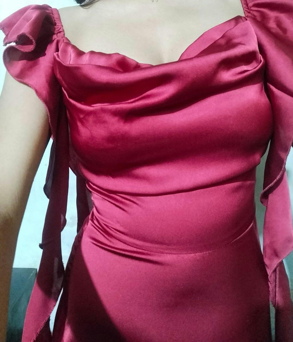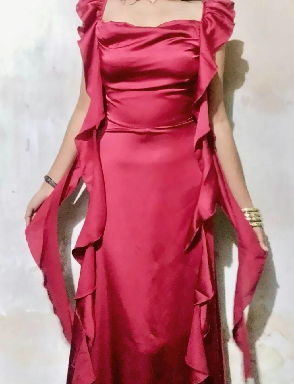 Featuring a flattering cowl neckline, flowing ruffle accents down the sides, and a figure-skimming silhouette, it’s a statement piece for evenings that demand glamour. The satin finish adds a soft sheen, making it the perfect cherry red dress for romantic dinners, cocktail nights, or any special event.