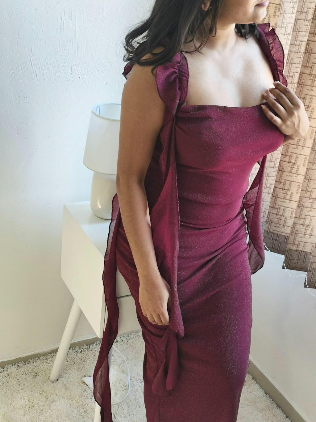 This sleeveless bodycon midi dress is made to stand out with subtle drama and a flattering fit. Designed in a rich Maroon shade, it features soft ruffle detailing along the straps and sides that adds movement without taking away from the clean bodycon silhouette. The gentle shimmer finish catches light beautifully, giving the dress an elevated feel while still keeping it wearable. The midi length balances the fitted shape, making it look sleek and confident.