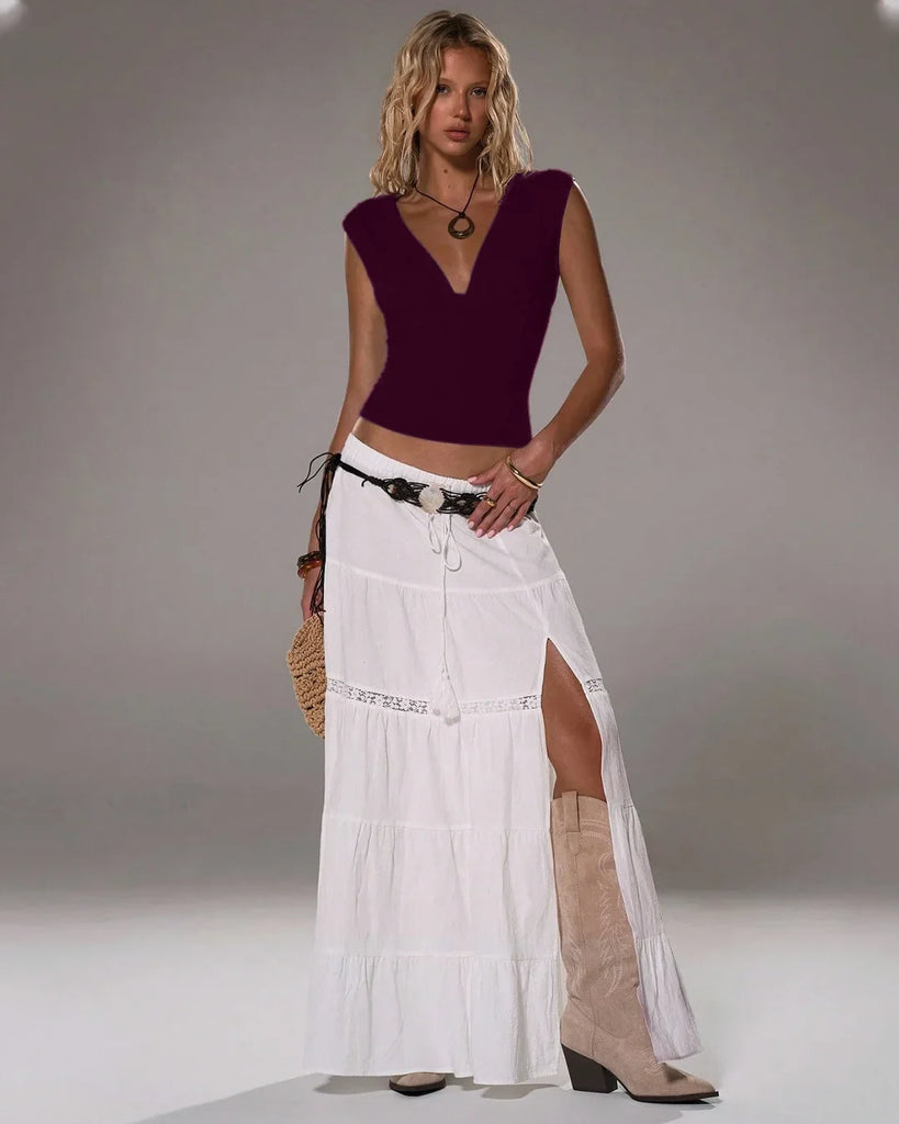 This crop top in maroon redefines minimal chic with a sultry edge. Featuring a deep V-neckline and ruched bodice, it hugs your frame while adding subtle dimension to your look. The sleeveless cut keeps it breezy and bold—perfect for layering or styling solo. Made with a blend of polyester, viscose, and lycra, this crop top in maroon offers just the right amount of stretch for an easy, flattering fit.