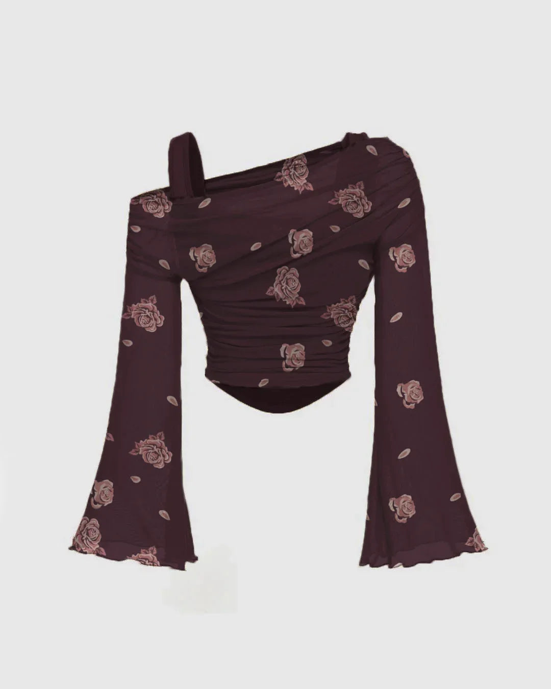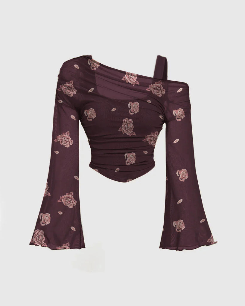Floral One Shoulder Ruched Flared Sleeve Top
