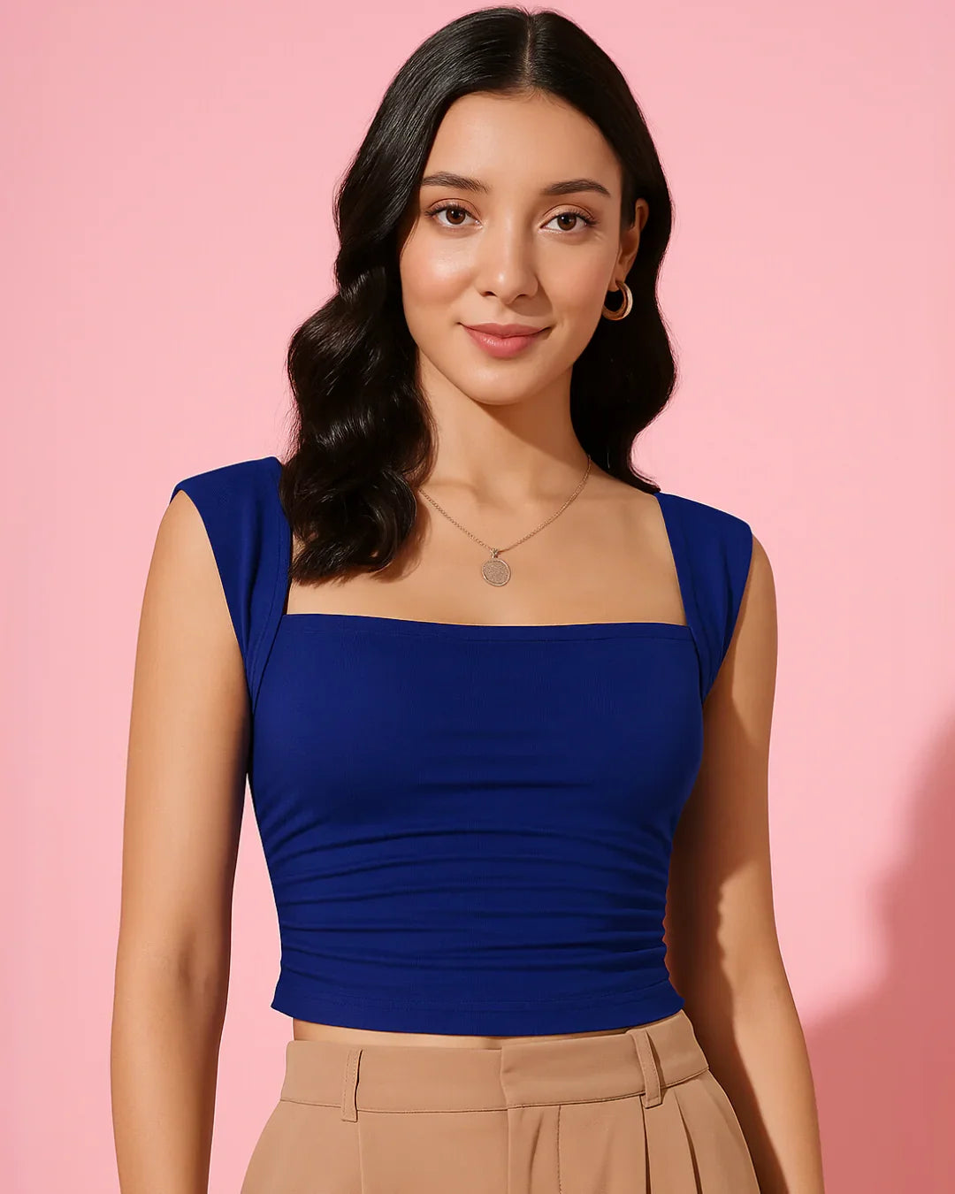 Surf Blue Square Neck Ruched Crop Top brings a bold pop of color and a flattering silhouette to your wardrobe. Designed with a sleek square neckline and side ruching, this square neck crop top is perfect for both layering and wearing solo. The body-hugging fit enhances your shape while the vibrant surf blue tone turns heads anywhere you go.