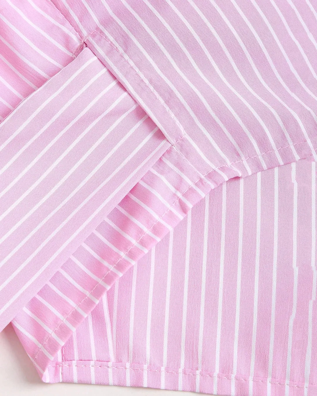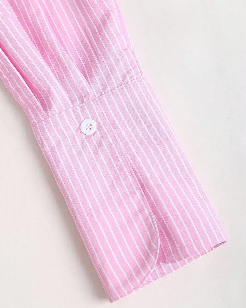 This long sleeve wrap top is all about sleek tailoring with a feminine twist. Designed with a collared neckline, wrap-style front, and tie-back closure, it blends structure with softness. The subtle pink stripes add a playful yet polished vibe, making it perfect for everything from coffee catch-ups to semi-formal evenings.