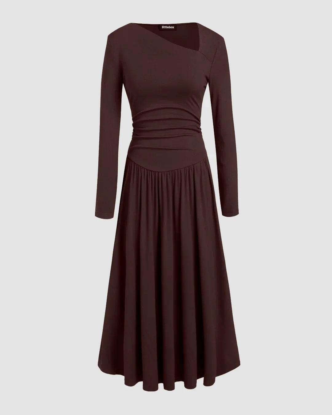 Asymmetrical Neck Long Sleeve Ruched Maxi Dress in Chocolate Fondae