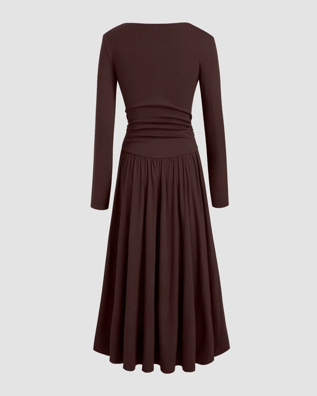 Asymmetrical Neck Long Sleeve Ruched Maxi Dress in Chocolate Fondae is all about clean lines with a soft, flattering fit. The asymmetrical neckline adds a modern edge, while the ruched detailing through the waist creates a naturally sculpted shape without feeling restrictive. Designed with full-length sleeves and a flowy maxi silhouette, this dress balances structure and ease perfectly. The fabric blend feels smooth and breathable, making it comfortable enough for long hours while still looking polished. The rich chocolate fondae tone keeps the look classy, minimal, and easy to style.