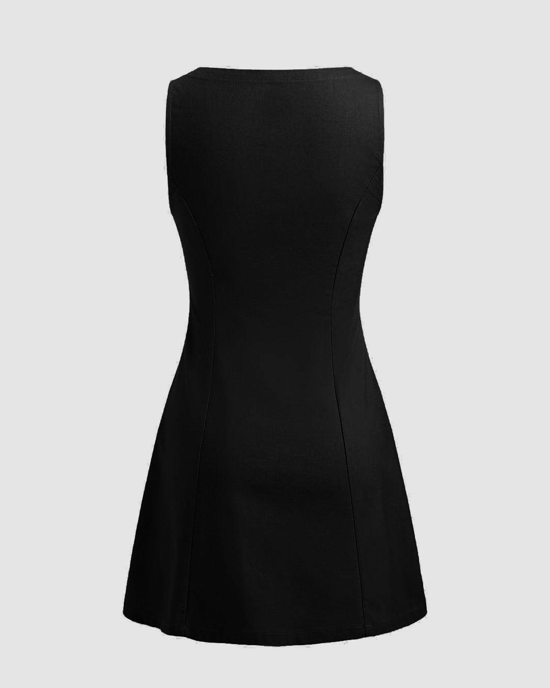 Black Boat Neck Solid Button Sleeveless Mini Dress