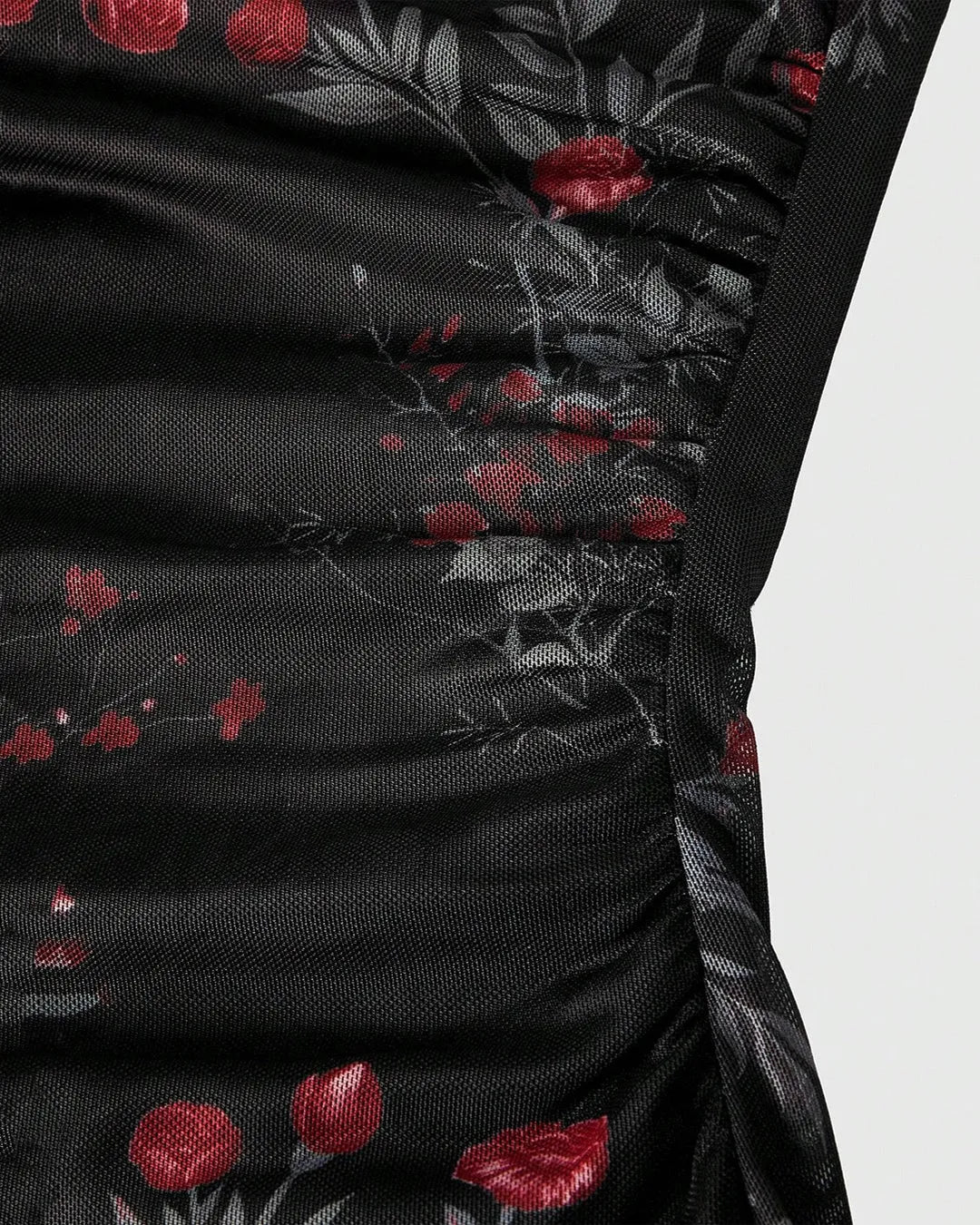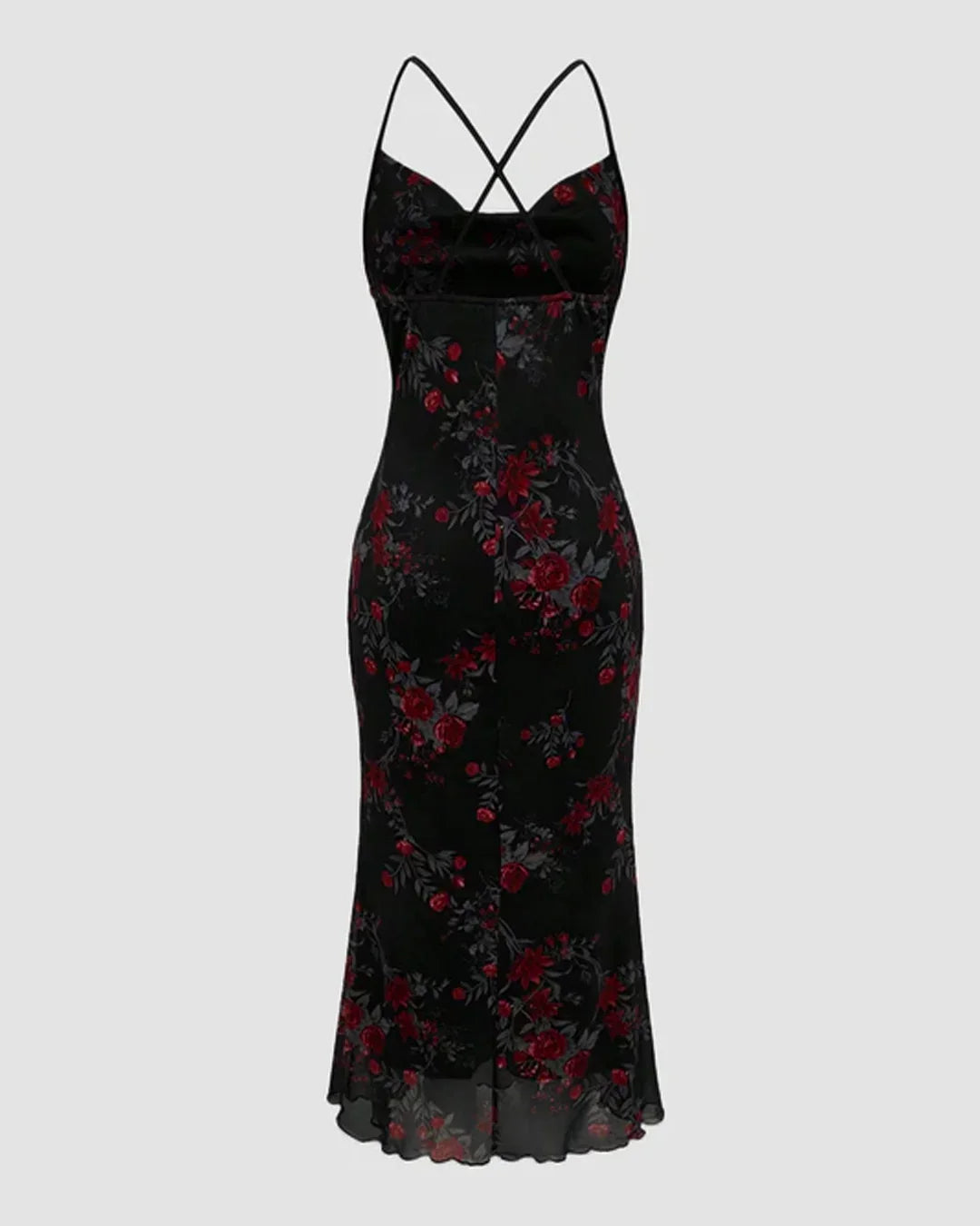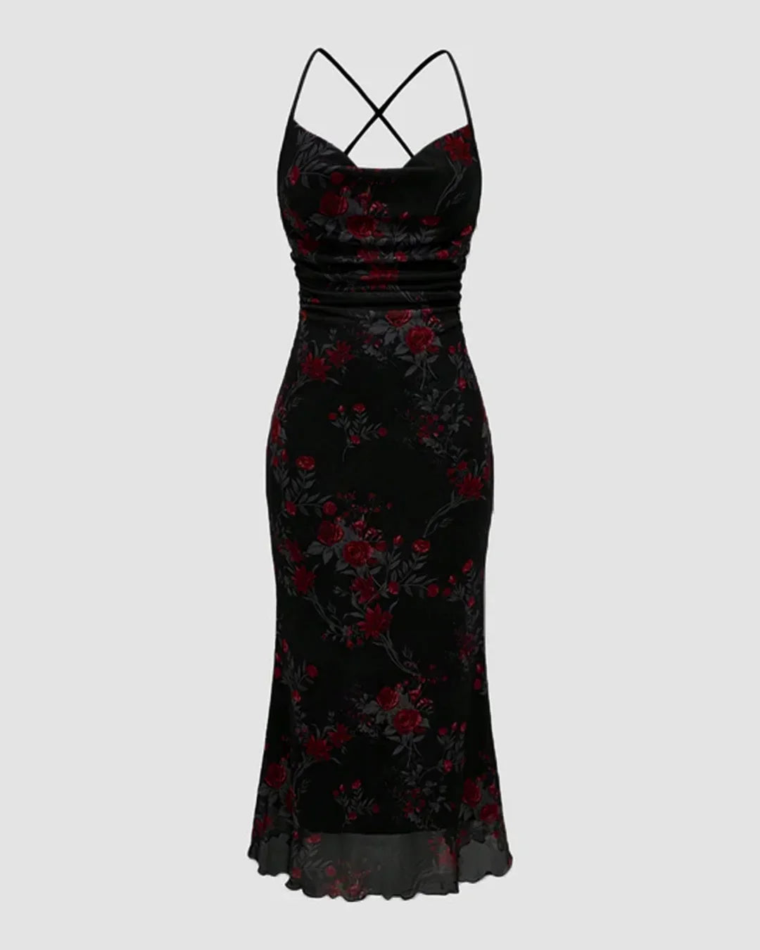 Black Retro Floral Cowl Neck Bodycon Midi Dress with Mermaid Hem brings together vintage charm and a sculpted silhouette. Designed with a soft cowl neckline and delicate criss-cross straps at the back, this dress highlights the neckline while keeping the look elegant. The ruched bodycon fit hugs the curves comfortably, while the mermaid hem adds a graceful flow at the bottom. Crafted in a stretch-blend fabric, it feels smooth on the skin and moves easily with you, making it perfect for long hours of wear.