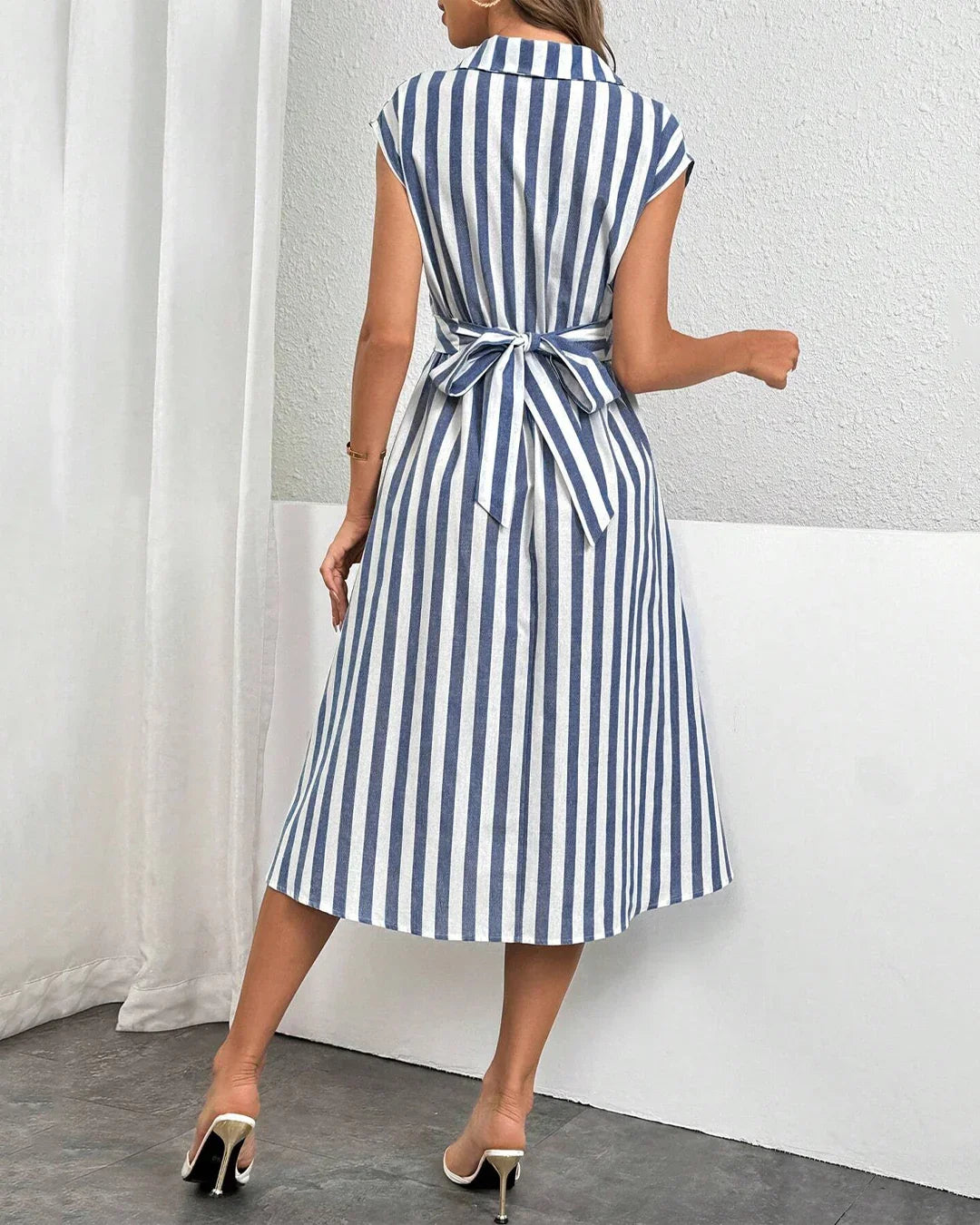 Blue & White Striped Collared Wrap A-Line Midi Shirt Dress
