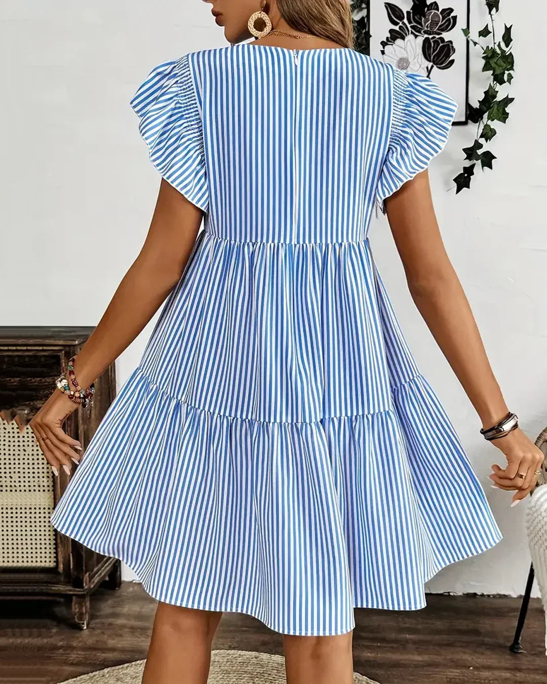 Blue & White Striped Ruffle Sleeve Tiered Mini Dress