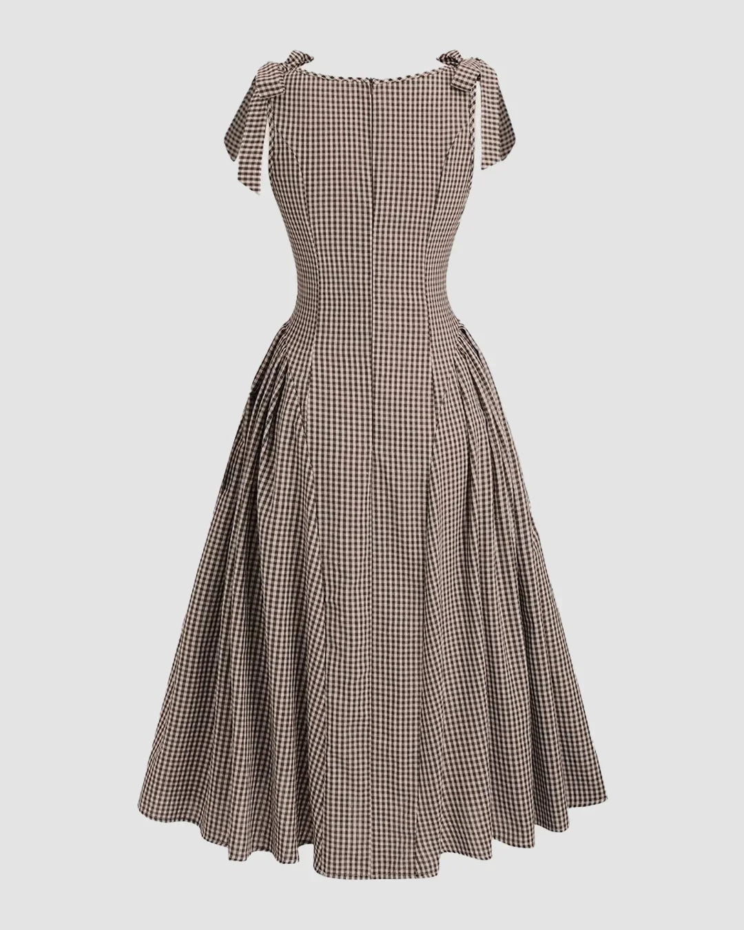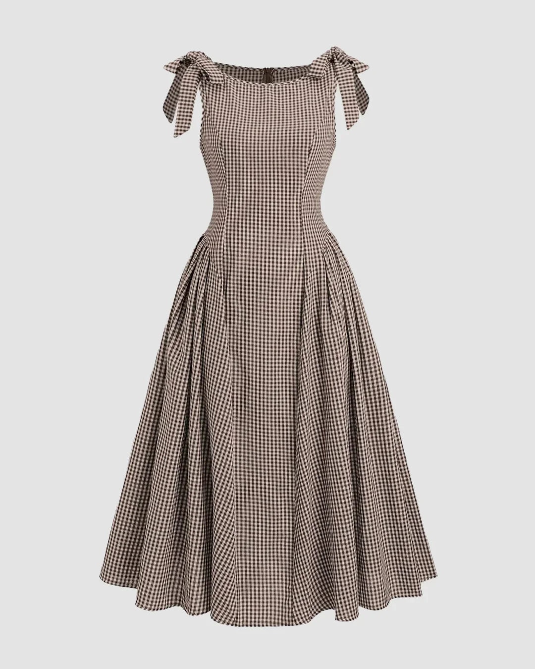 Boat Neck Slim Fit Flared Hem Gingham Tie-Strap Midi Dress