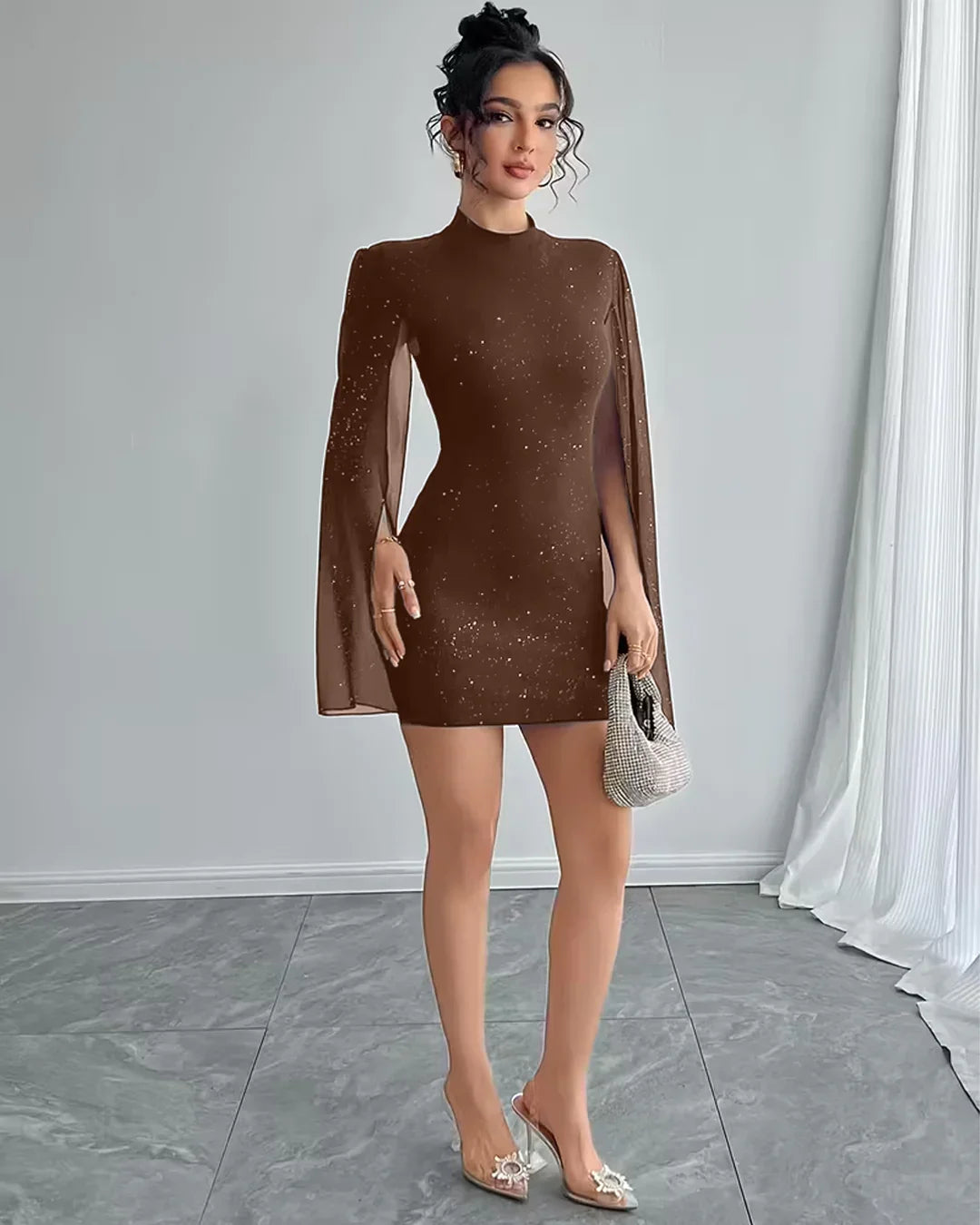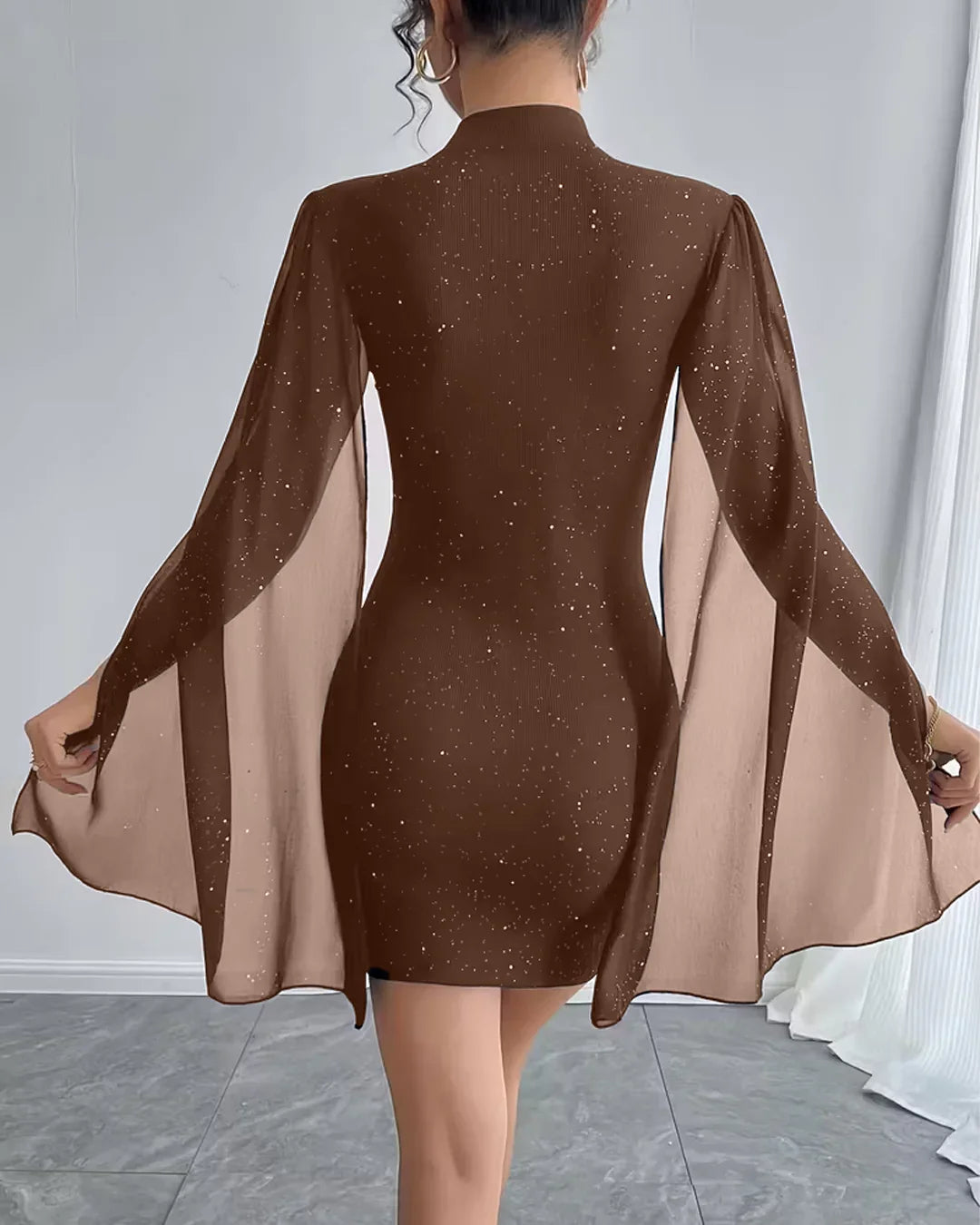 Bodycon Mini Dress Crew Neck Lantern Sleeves in Brown