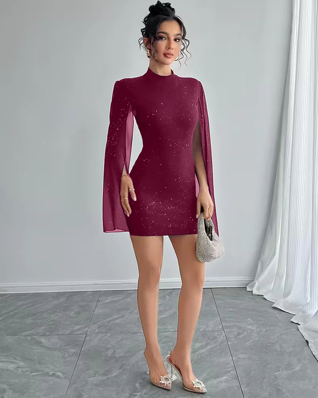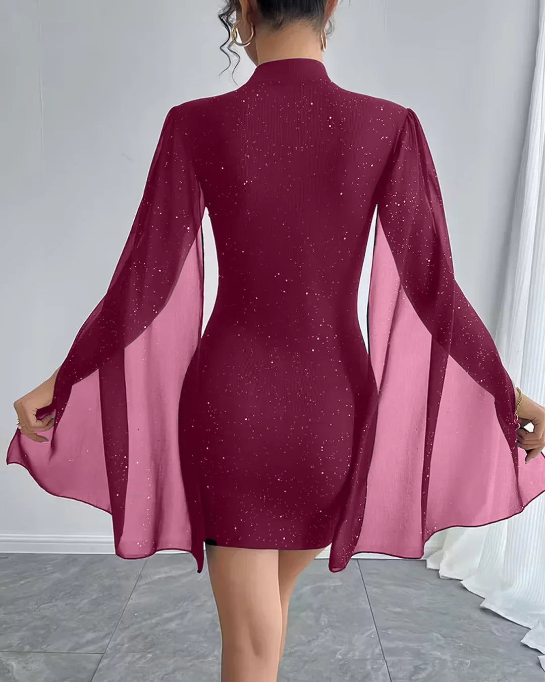 Bodycon Mini Dress Crew Neck Lantern Sleeves in Maroon