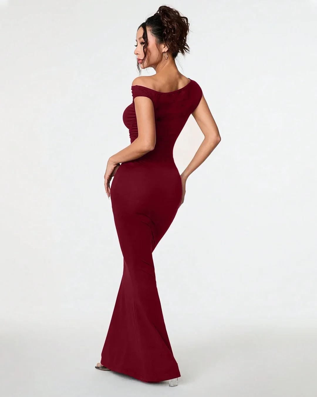 This burgundy bodycon dress is designed to sculpt and flatter with a sleek, figure-hugging fit. The off-shoulder neckline highlights the collarbone, adding a refined yet bold touch to the silhouette. The fitted bodice flows into a slightly flared maxi hem, creating a balanced shape that feels elegant and confident. The rich burgundy tone enhances the overall look, making this burgundy bodycon dress a standout choice for statement occasions.