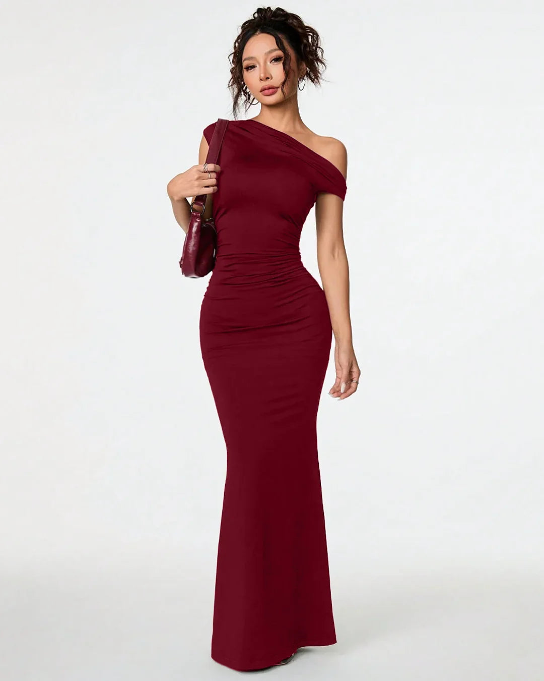 Burgundy Asymmetrical Neck Bodycon Maxi Dress