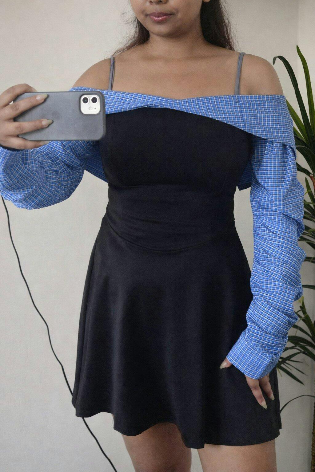 This Off Shoulder Mini Dress blends a bold shape with a unique contrast sleeve detail that instantly stands out. The black body creates a clean, fitted look while the checkered sleeves add a playful twist. The off shoulder neckline gives a chic, modern vibe and the soft stretch of the fabric makes it easy to move in. The slight flare at the hem adds balance, making the silhouette flattering and fun. This Off Shoulder Mini Dress combines structure and comfort in a way that feels fresh and stylish.