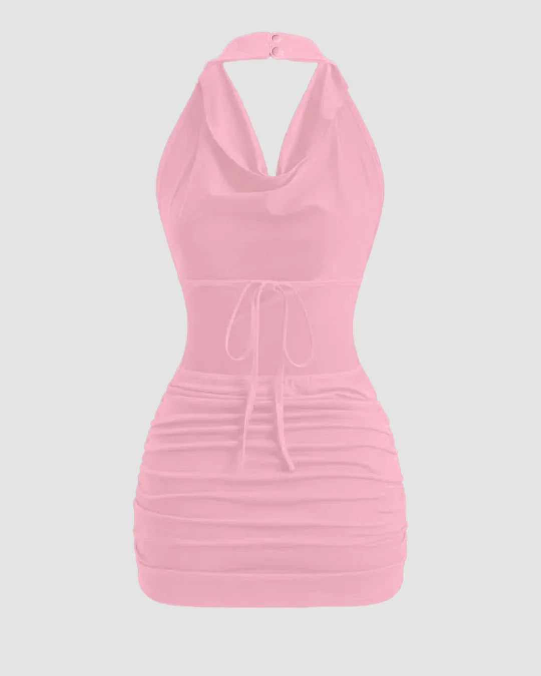 Cowl Neck Backless Tie Strap Sleeveless Sexy Bodycon Mini Dress in Rose Pink