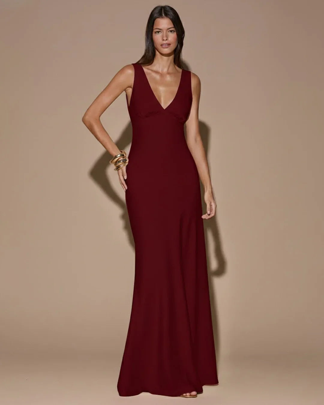 Deep V-Neck Sleeveless Backless Tie Maxi Dress in Red