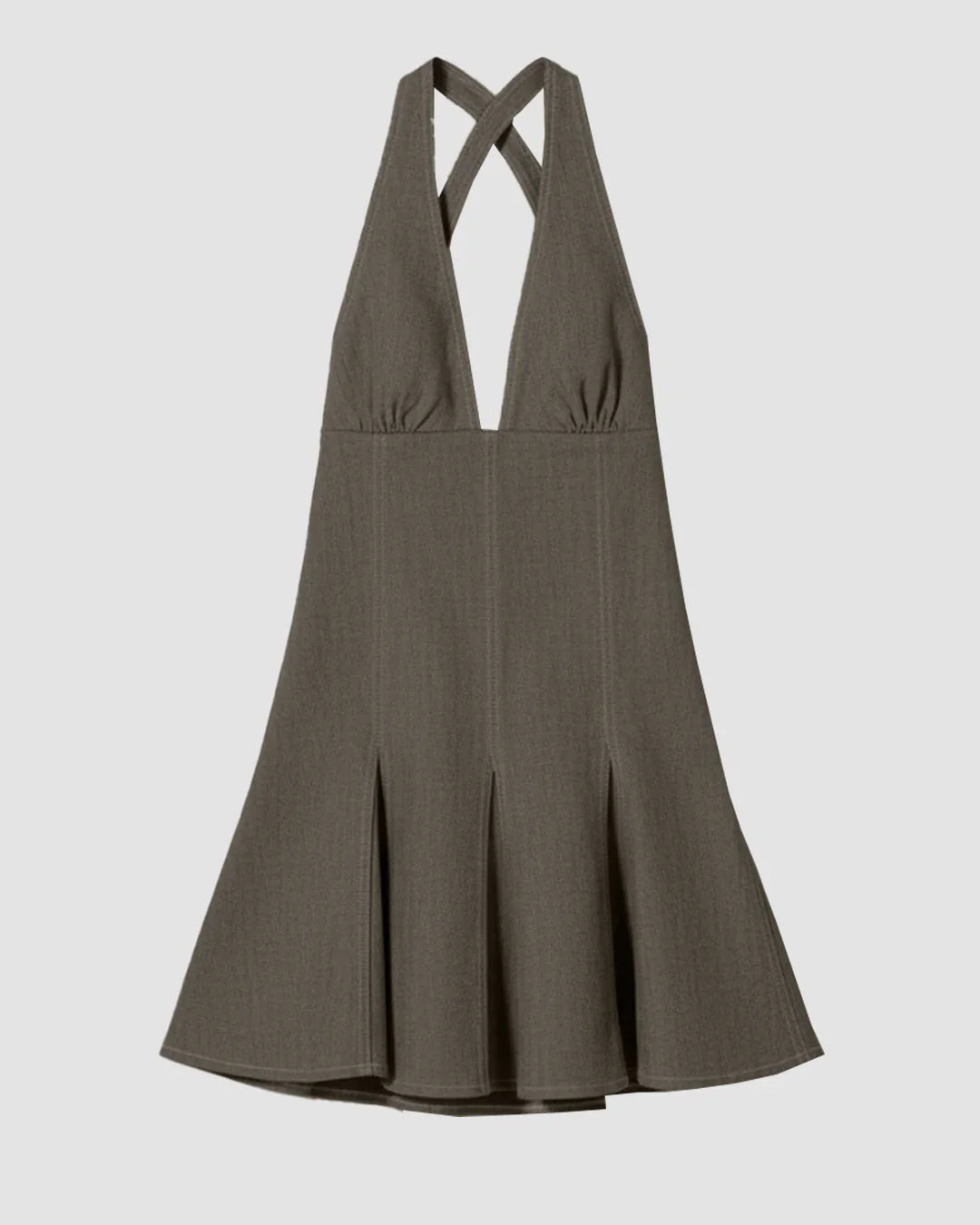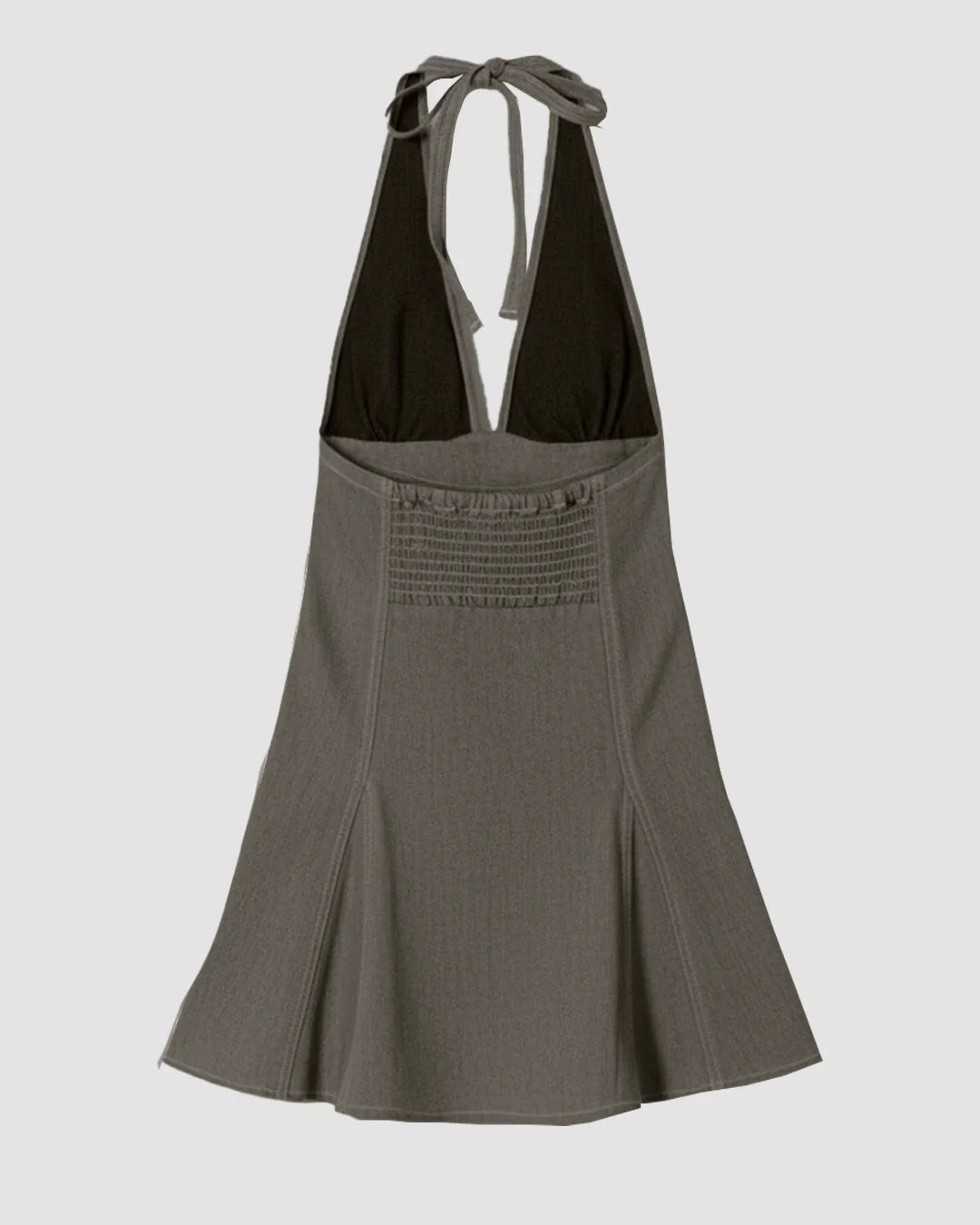 Halter Neck Fit & Flare Solid Sleeveless Mini Dress in Dark Grey