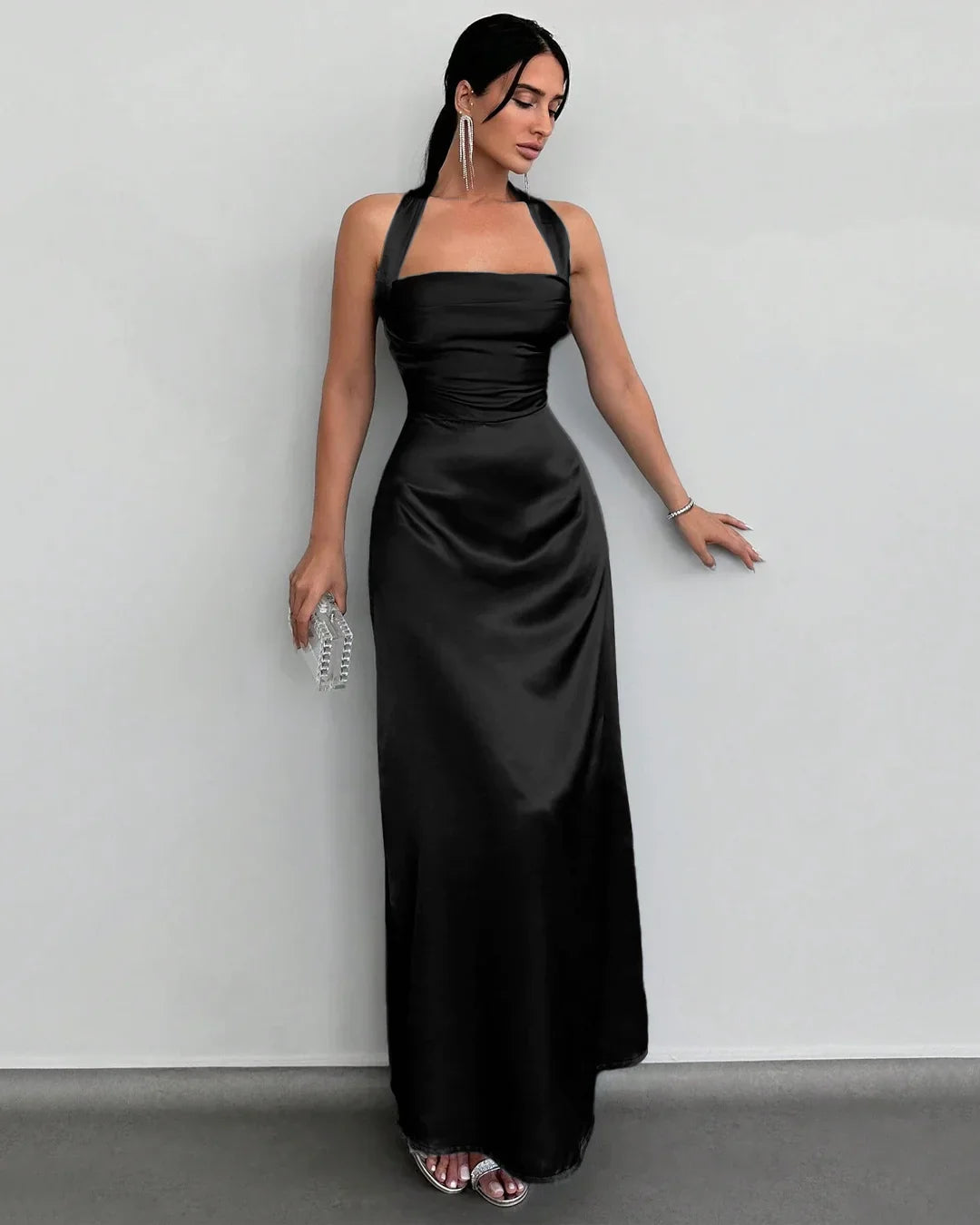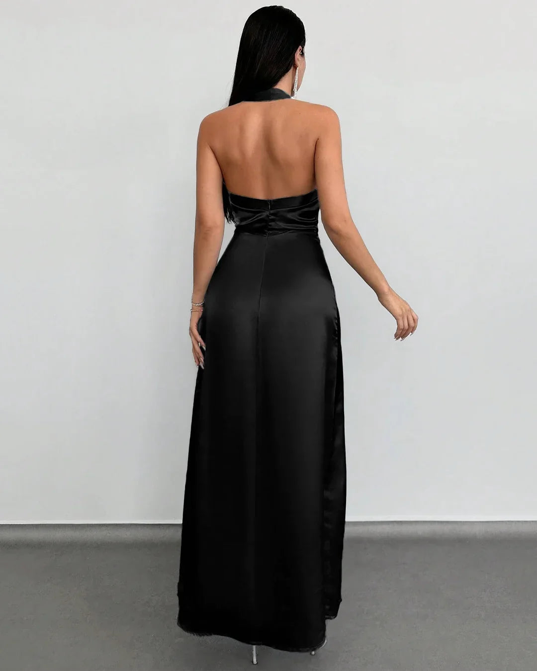 This halter neck long dress brings clean elegance with a smooth, flowy silhouette. The halter neckline highlights the shoulders, while the fitted upper body flows into a long, straight fall that feels polished and modern. The black tone keeps it timeless and easy to dress up, making this halter neck long dress a strong pick for evenings that need a little extra edge without going over the top.