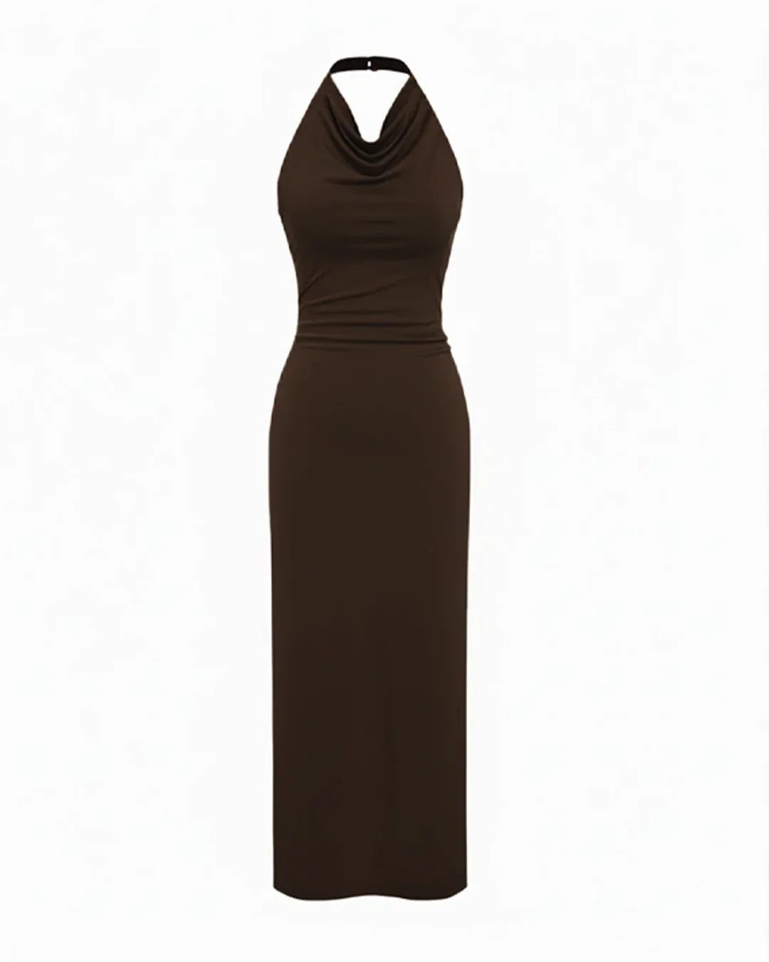 Halter Neckline Rivet Split Ruched Straight Maxi Dress in Chocolate
