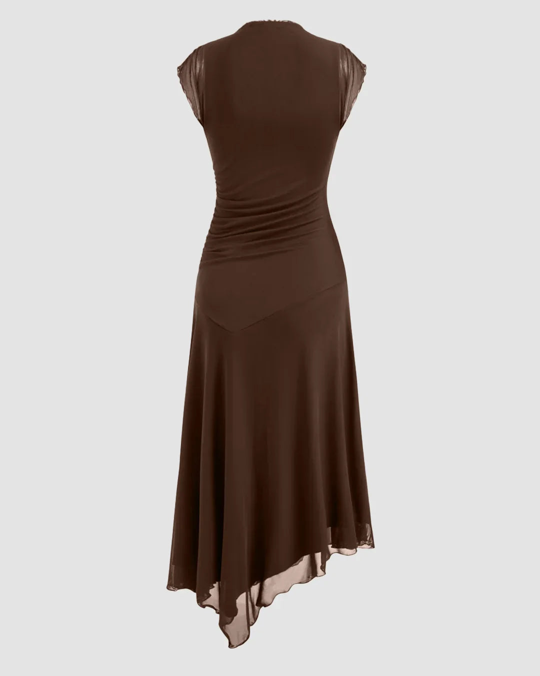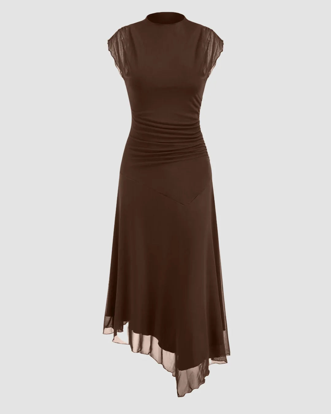 High Neck Ruched Asymmetrical Hem Midi Dress in Coco