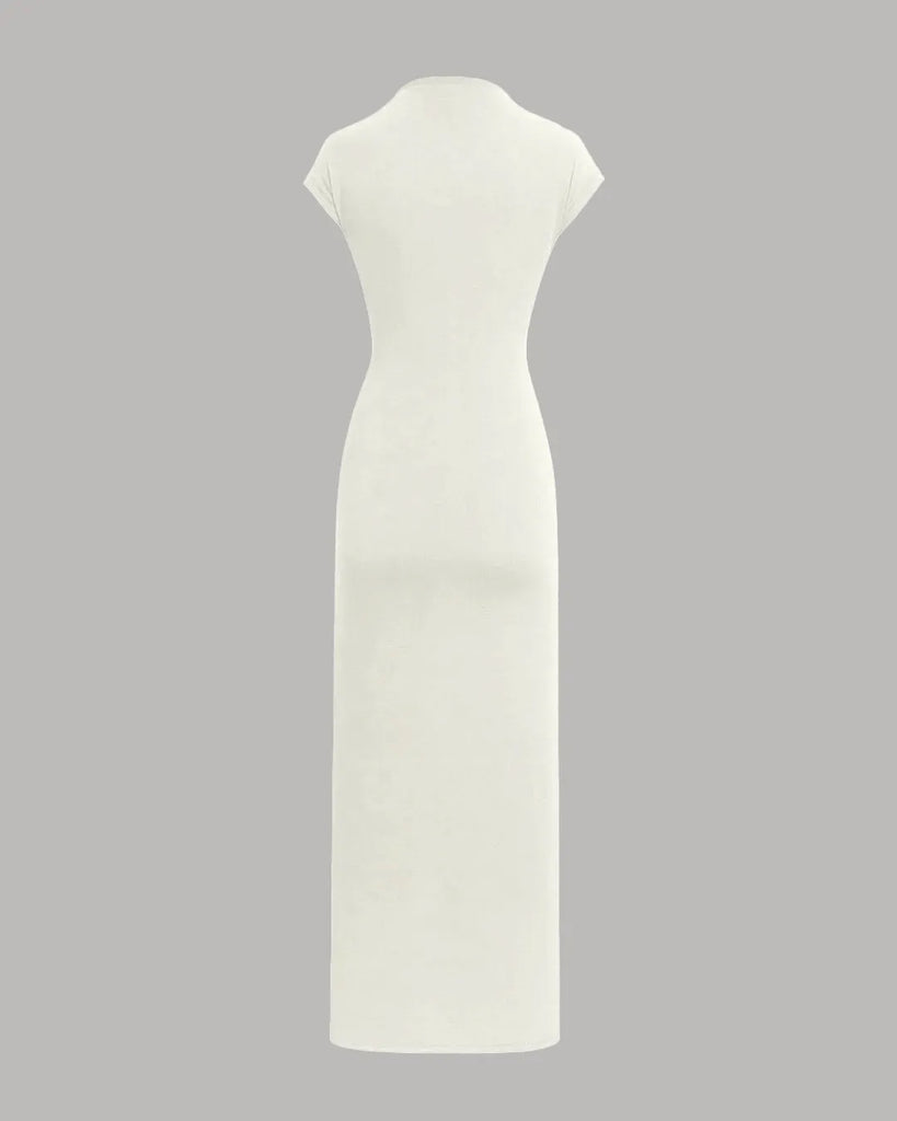Introducing our High Neck Solid Twist Ruched Split Maxi Dress In Milky White. This high neck maxi dress brings effortless charm with its elegant twist detail and soft gathered ruching. The smooth side split adds a touch of movement, while the clean silhouette keeps things classy.