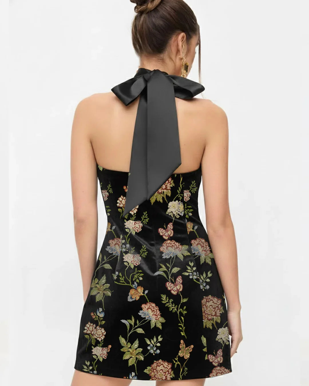 Jacquard Floral A-line Mini Dress with Bowknot scarf